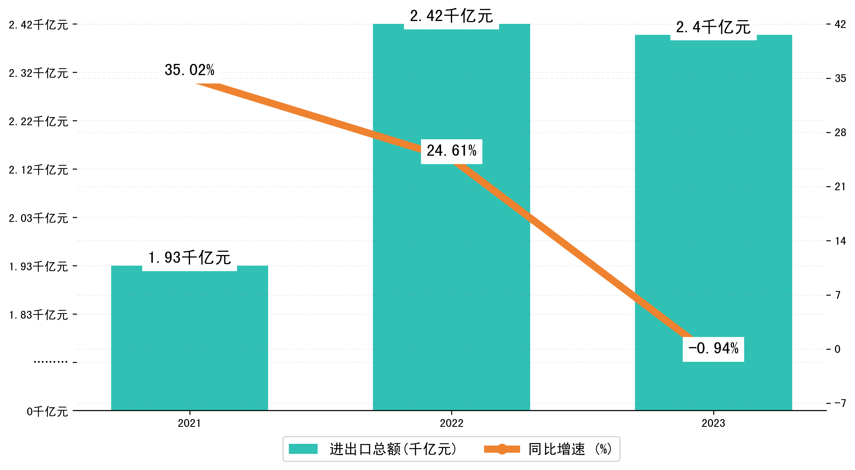 以人民币计,2023年1-10月温州市进出口总额为2400,2417.4038万元,相比上年同期减少了22,7942.1617万元,同比减少了-0.70%。