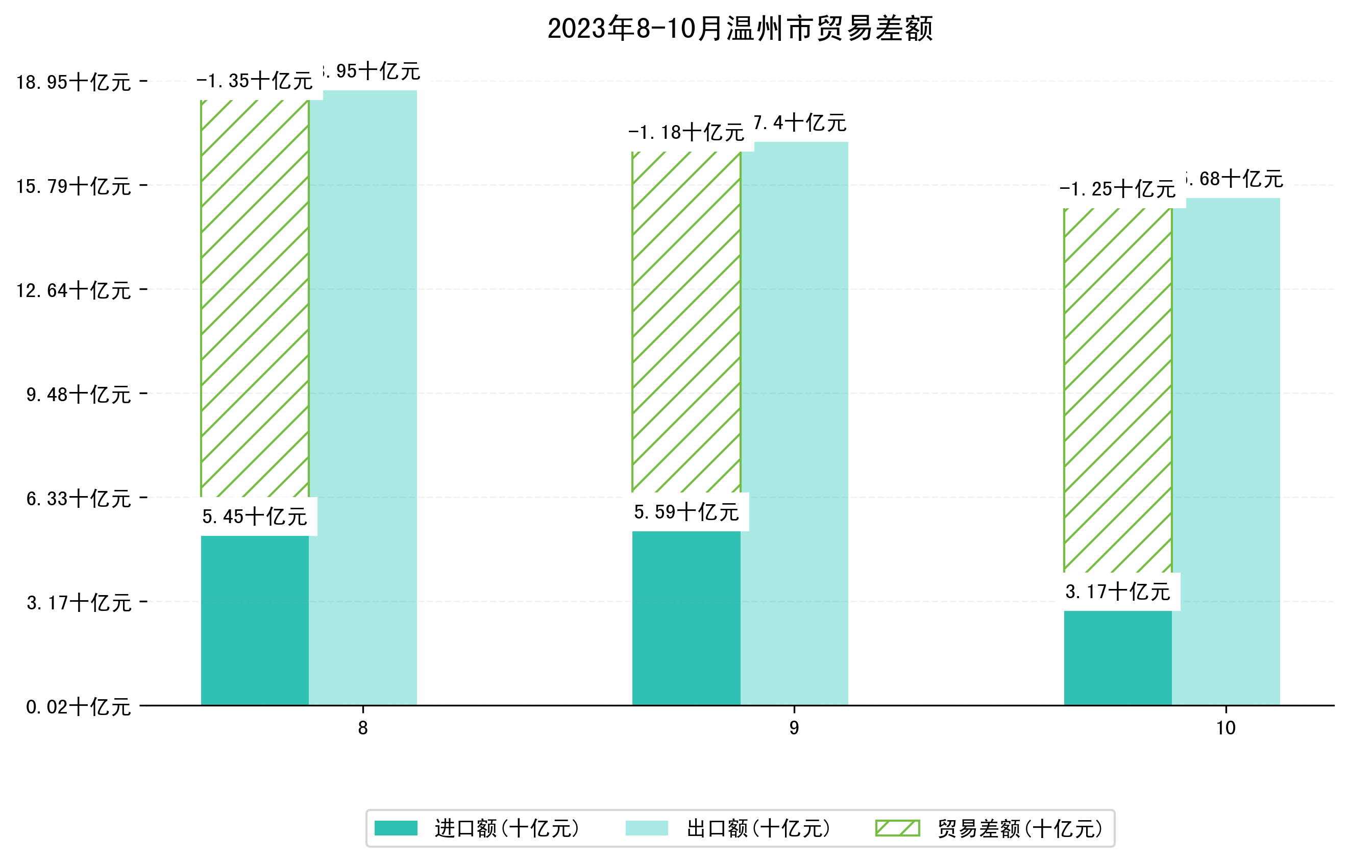 以人民币计,2023年10月温州市贸易差额为125,0863,6730万元(贸易顺差),相比上月增加了7,0107,5277万元,即9813,4212万美元;相比上年同期减少了37,0230,3827万元,同比减少-22.84%。