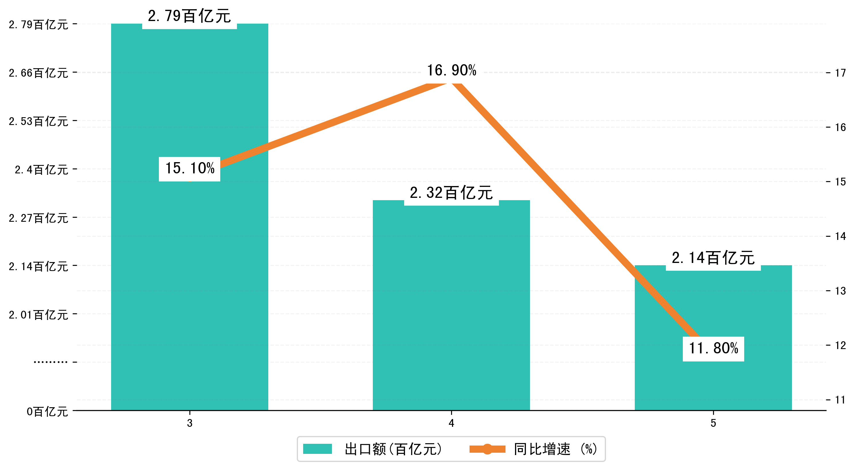 以人民币计,2023年5月温州市出口额为213,9519.4885万元,相比上月减少了17,6313.2835万元;相比上年同期减少了13,2459.824万元,同比增加了11.80%。