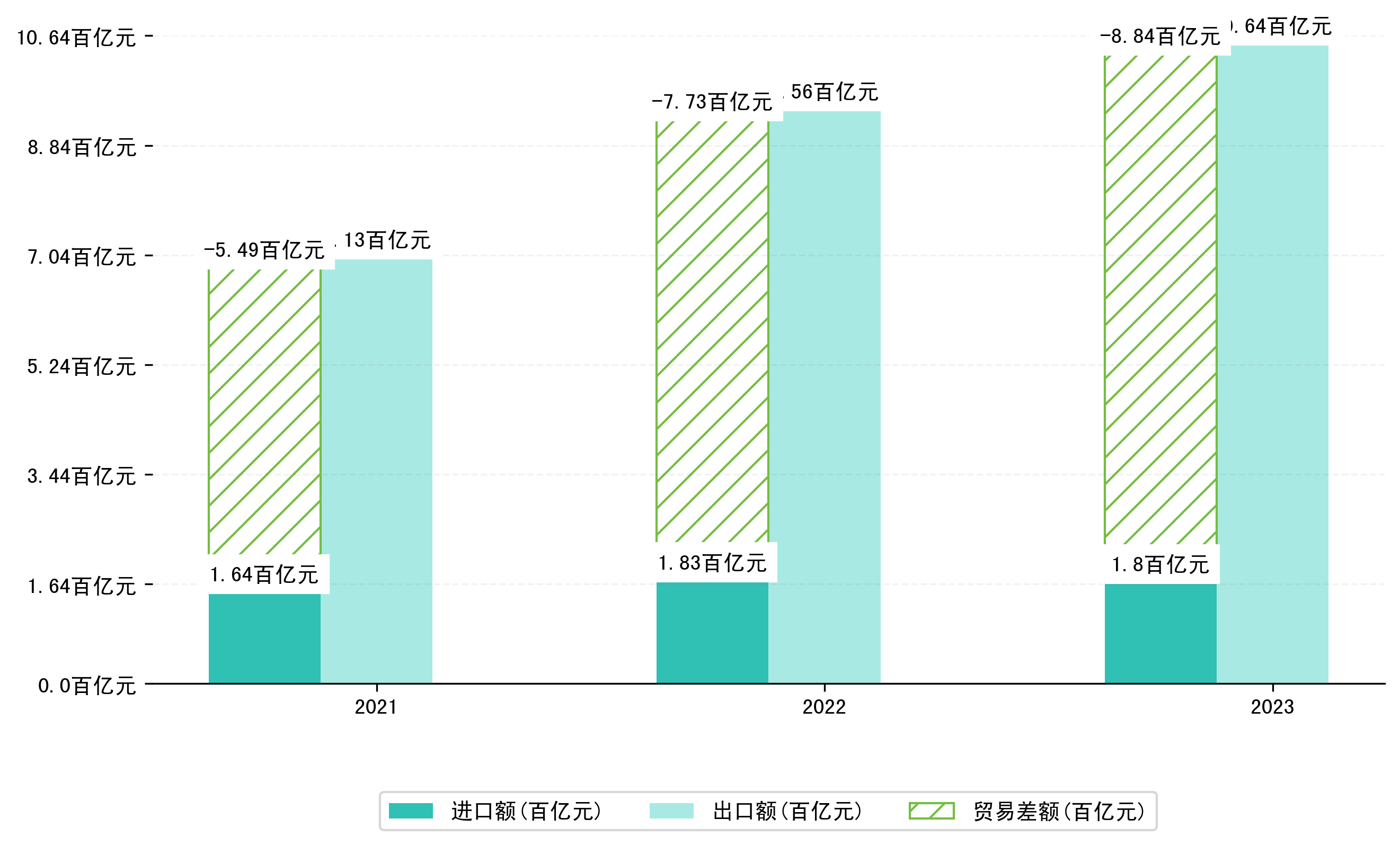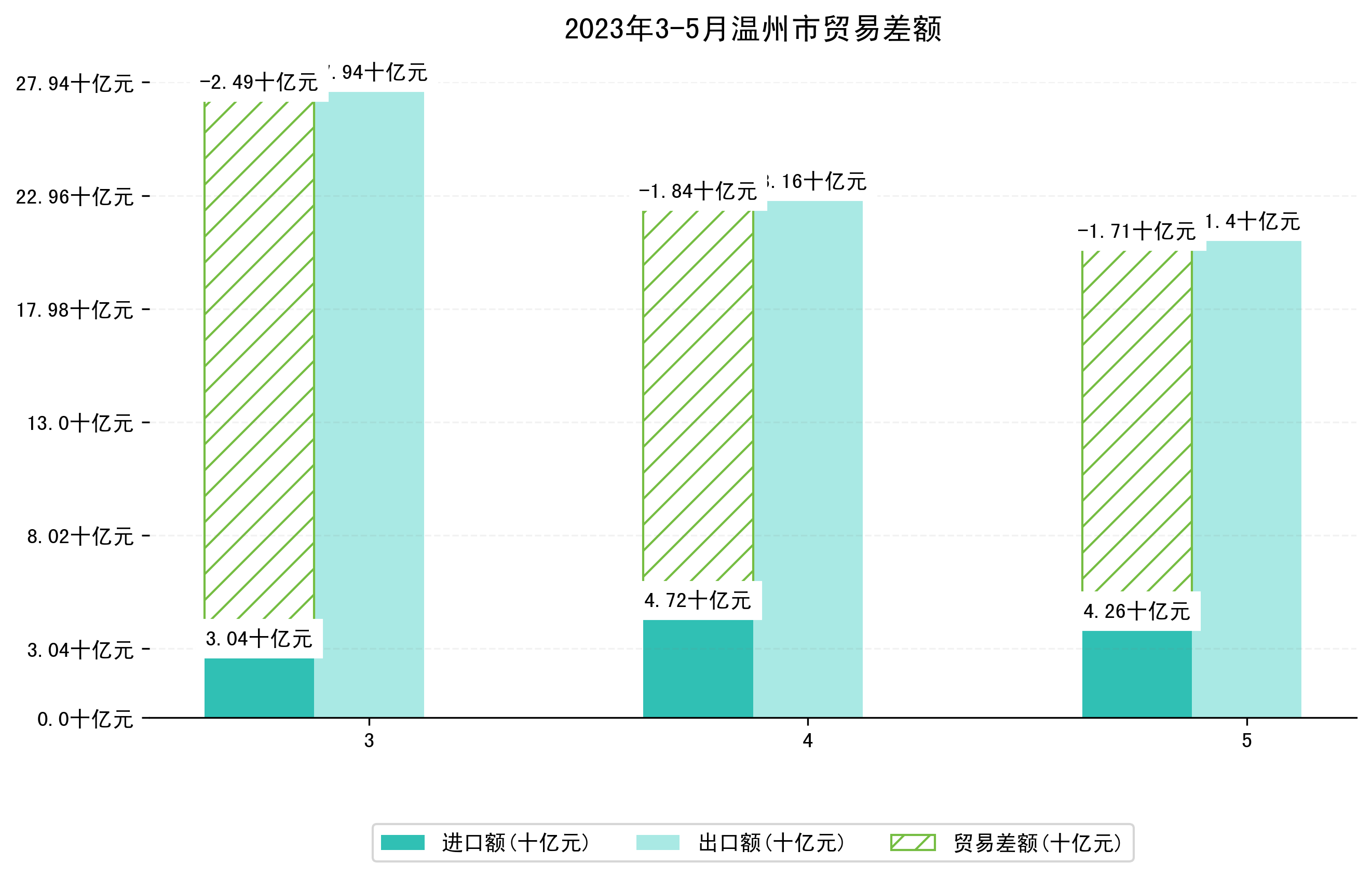 以人民币计,2023年5月温州市贸易差额为171,3406,7177万元(贸易顺差),相比上月减少了13,0321,3291万元,即1,9636,1521万美元;相比上年同期减少了21,0191,8353万元,同比减少-10.93%。