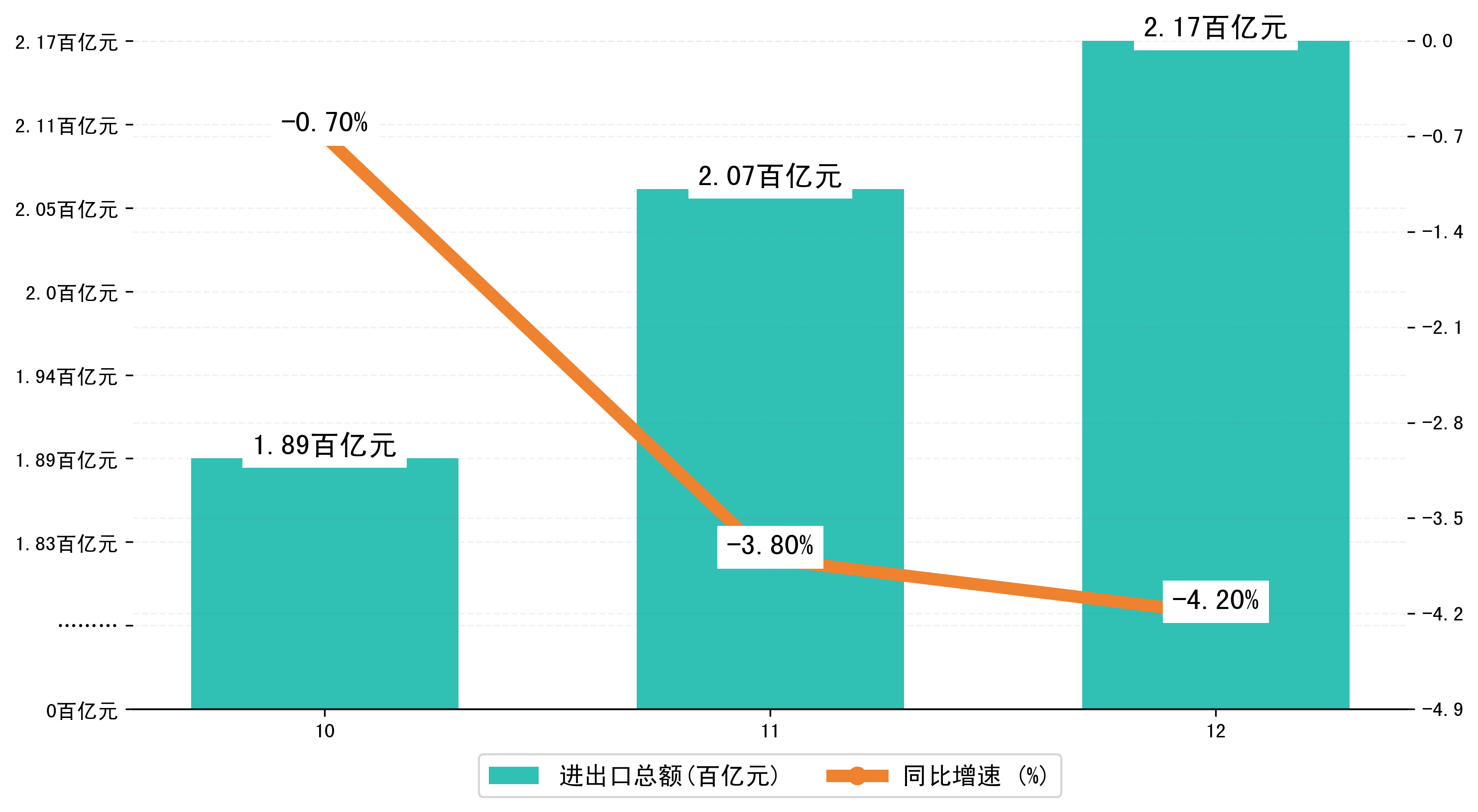 以人民币计,2023年12月温州市进出口总额为216,7019.0065万元,相比上月增加了9,9978.2508万元;相比上年同期减少了22,2116.8万元,同比减少了-4.20%。