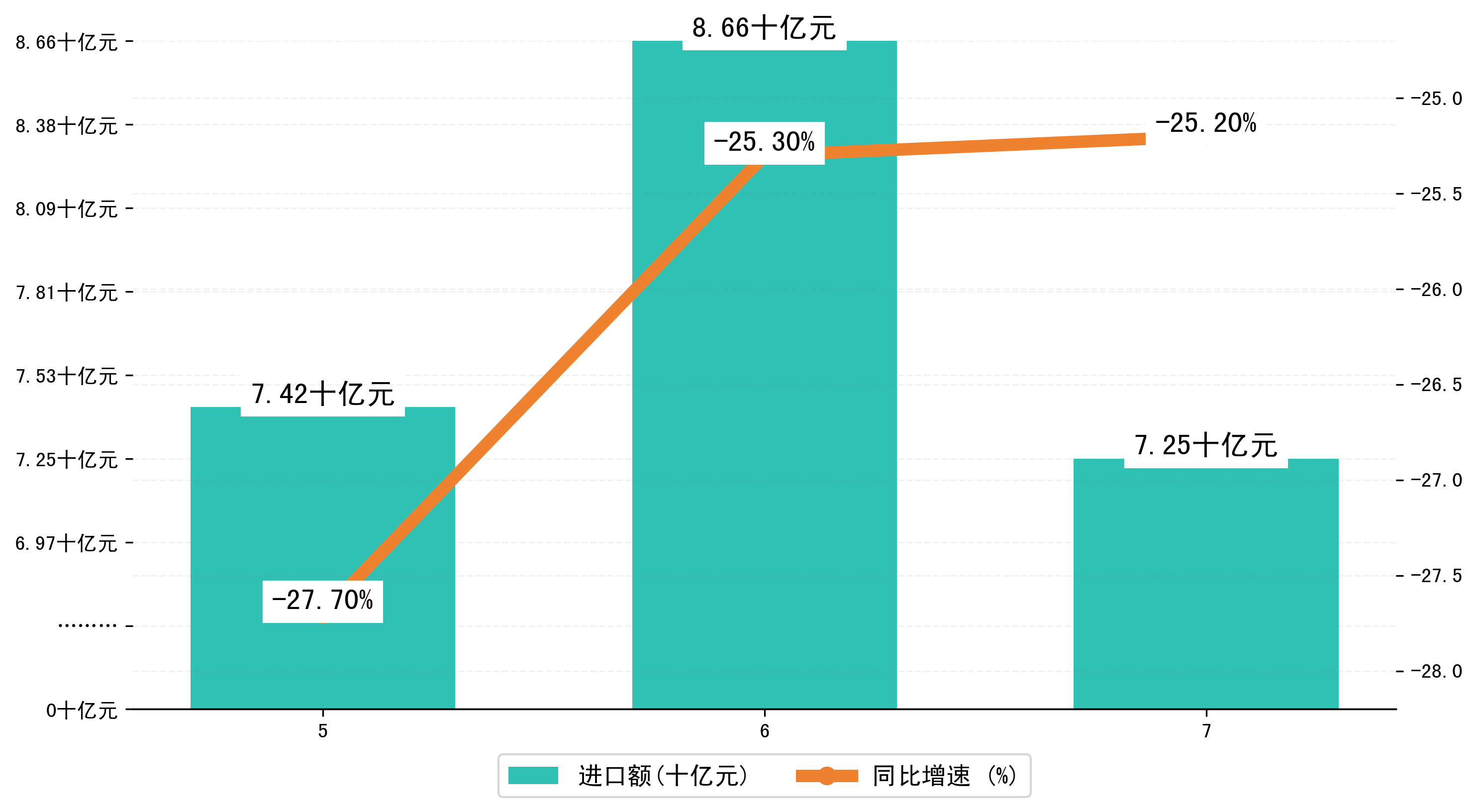 以美元计,2023年1-7月珠海市进口额为73,1003.4195万美元,相比上年同期减少了31,8940.8632万美元,同比减少-30.10%。