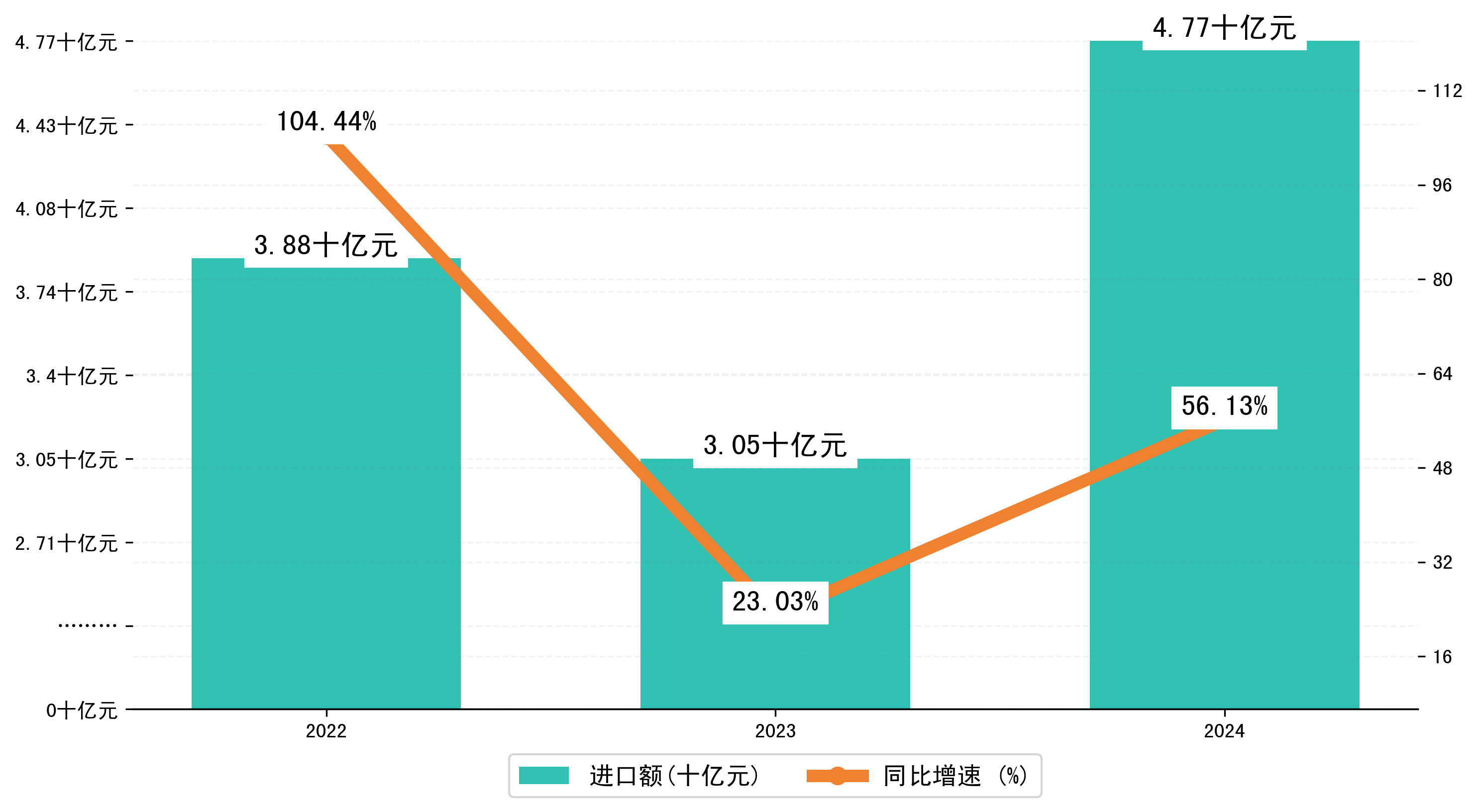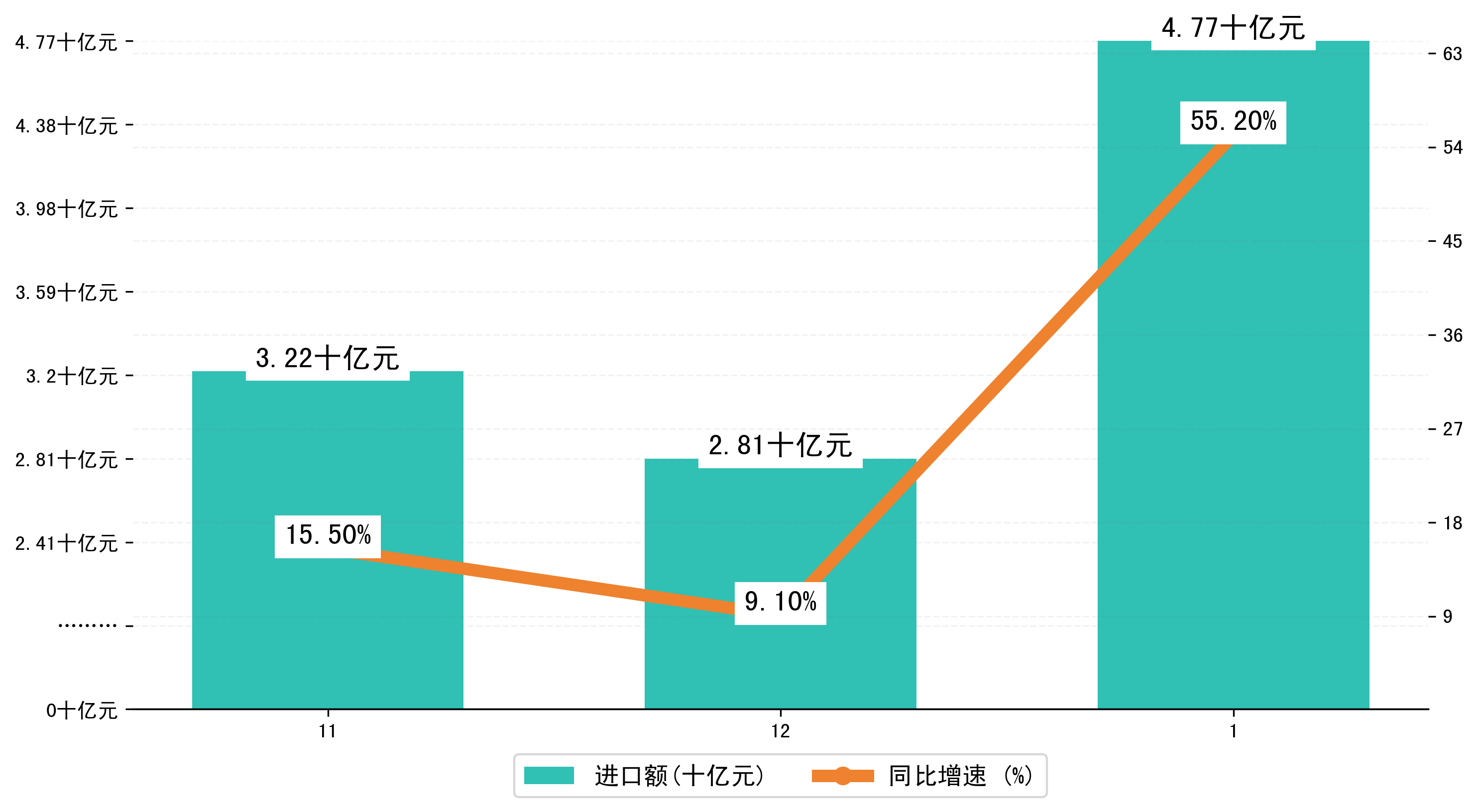以人民币计,2024年1月温州市进口额为47,6807.1458万元,相比上月增加了19,6118.9185万元;相比上年同期增加了17,1414.9538万元,同比增加了55.20%。