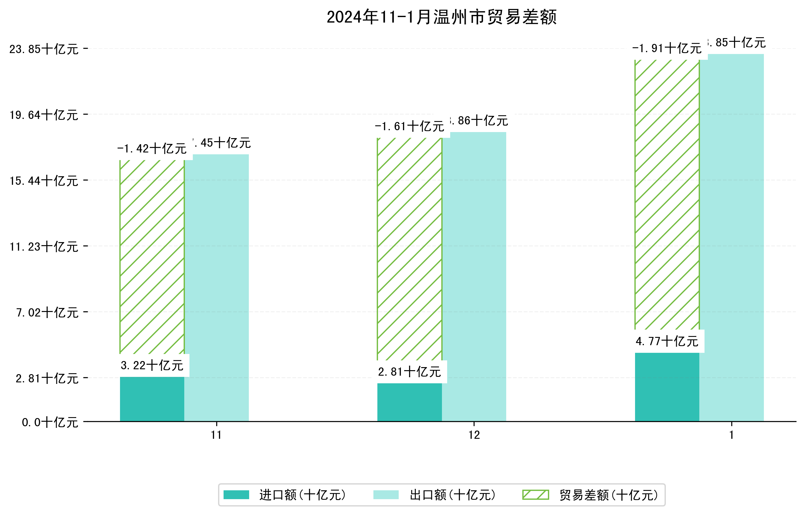 以人民币计,2024年1-1月温州市贸易差额为190,8583,1648万元(贸易顺差),相比上年同期减少了20,2475,0199万元,同比减少-9.59%。