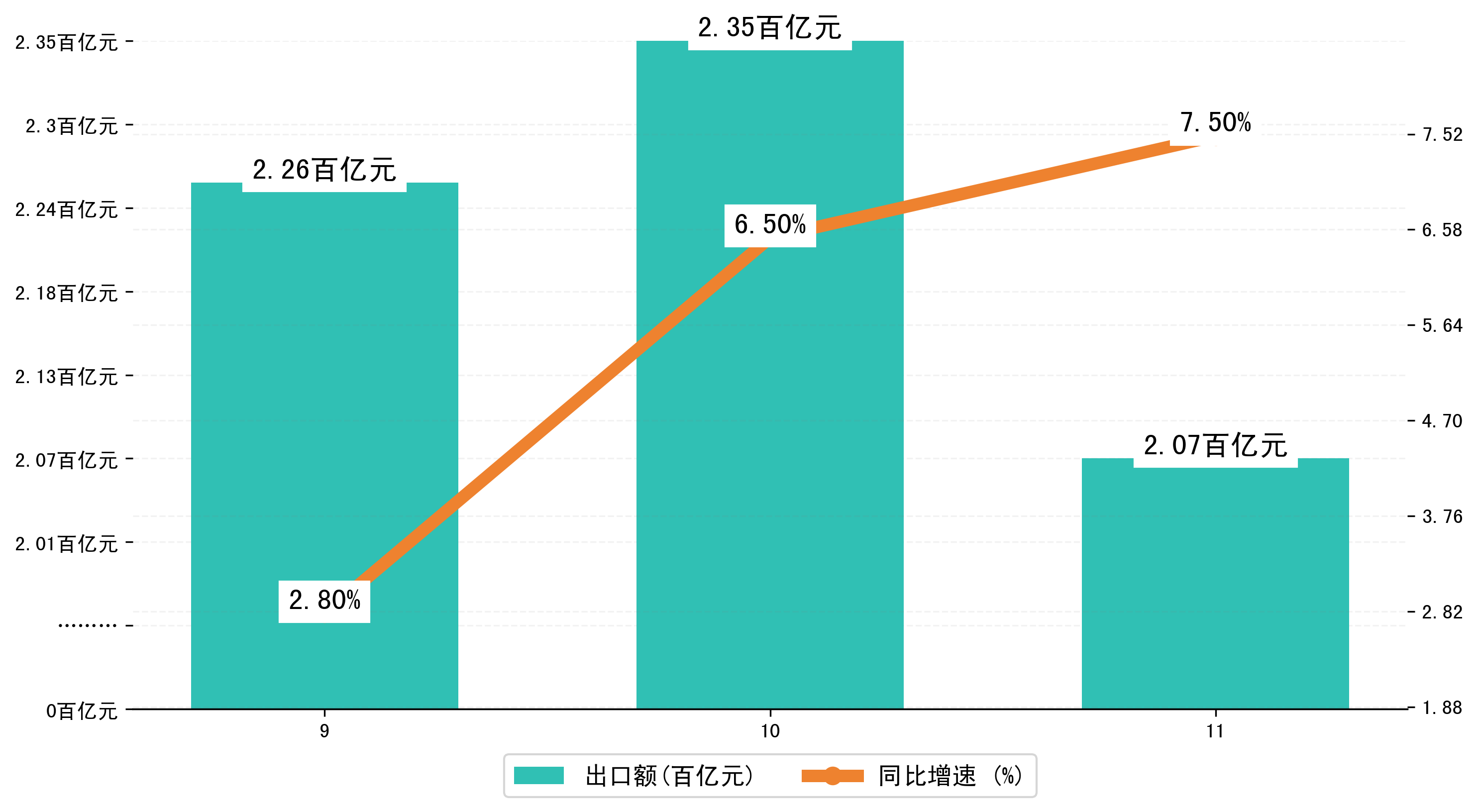 以人民币计,2024年1-11月温州市出口额为2311,9744.5152万元,相比上年同期增加了161,4633.3486万元,同比增加了7.50%。