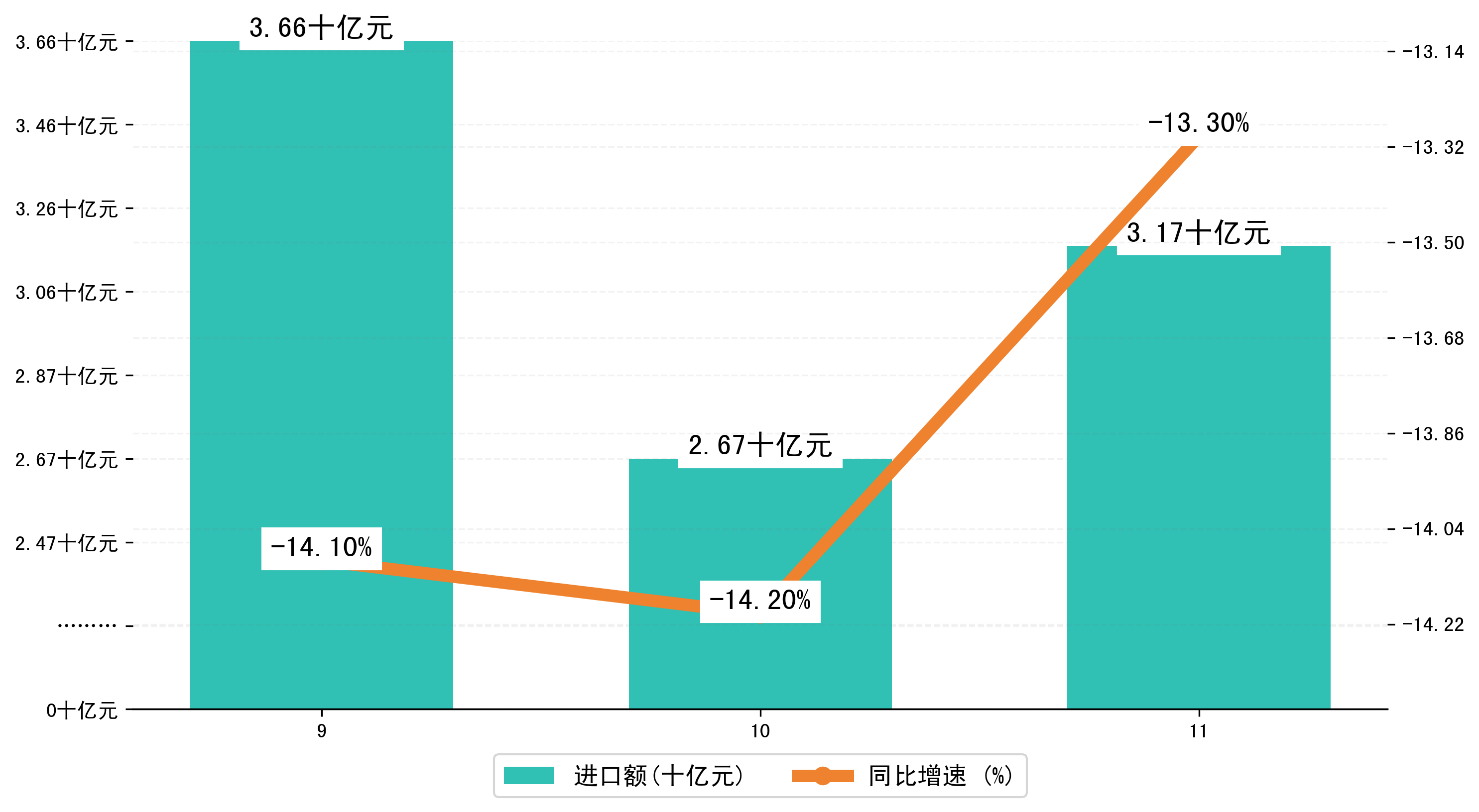 以人民币计,2024年11月温州市进口额为31,7267.5935万元,相比上月增加了5,0457.0126万元;相比上年同期减少了4446.0623万元,同比减少了-13.30%。