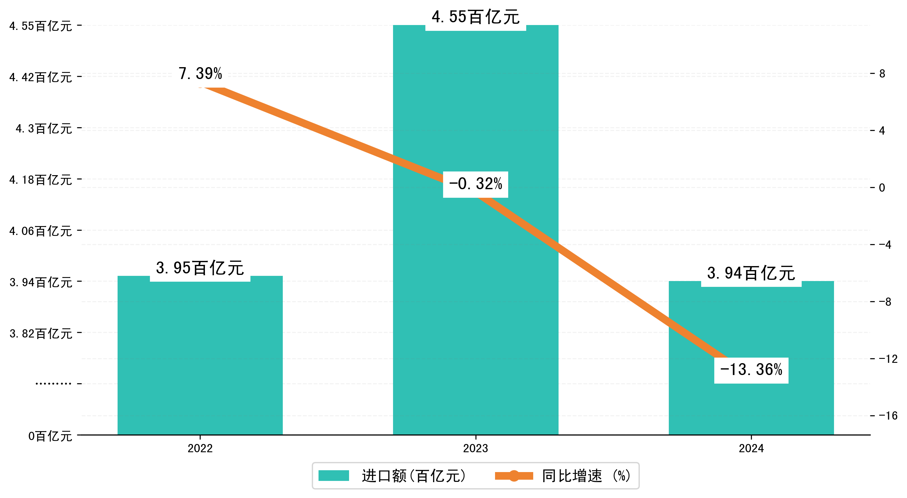 以人民币计,2024年1-11月温州市进口额为393,9134.3297万元,相比上年同期减少了60,7317.5263万元,同比减少了-13.30%。