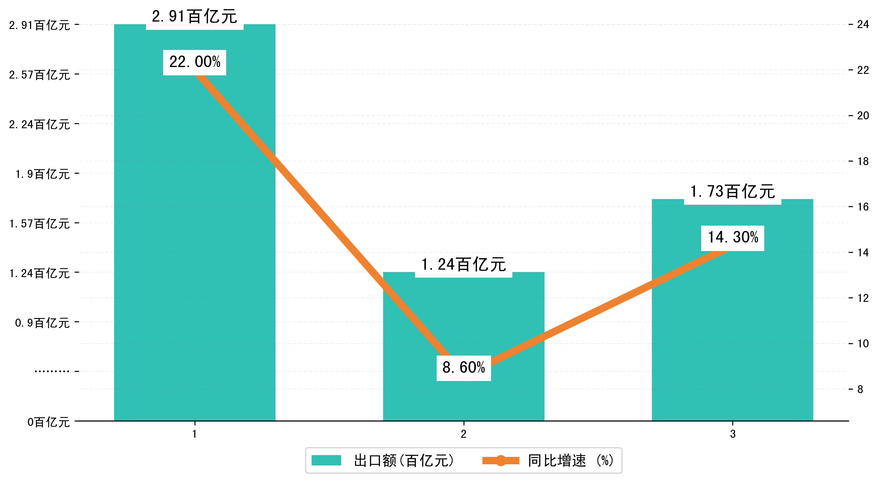 以人民币计,2025年1-3月温州市出口额为587,1806.998万元,相比上年同期增加了70,7368.2843万元,同比增加了14.30%。