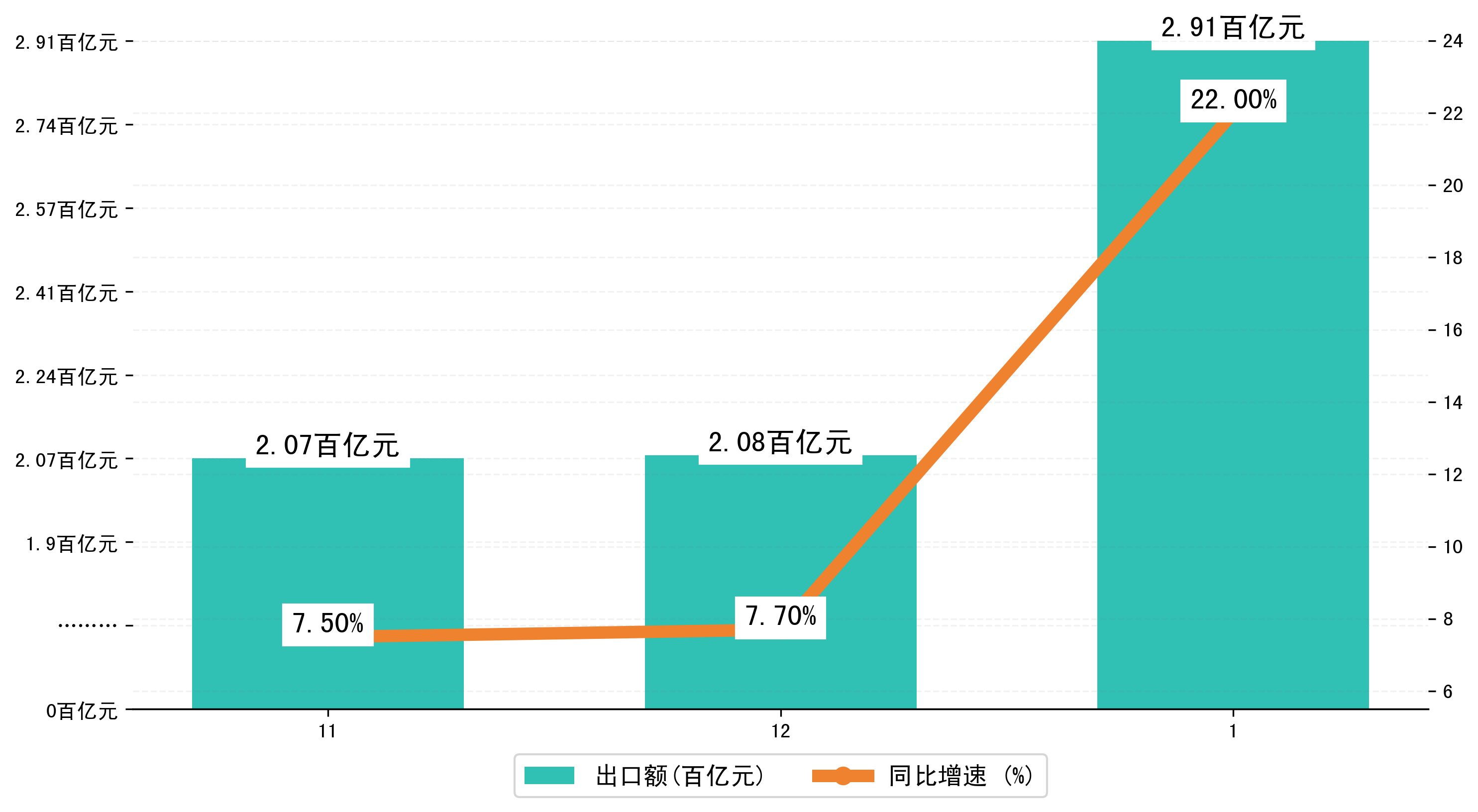 以人民币计,2025年1月温州市出口额为290,8000.5934万元,相比上月增加了83,1626.5483万元;相比上年同期增加了52,2610.2828万元,同比增加了22.00%。