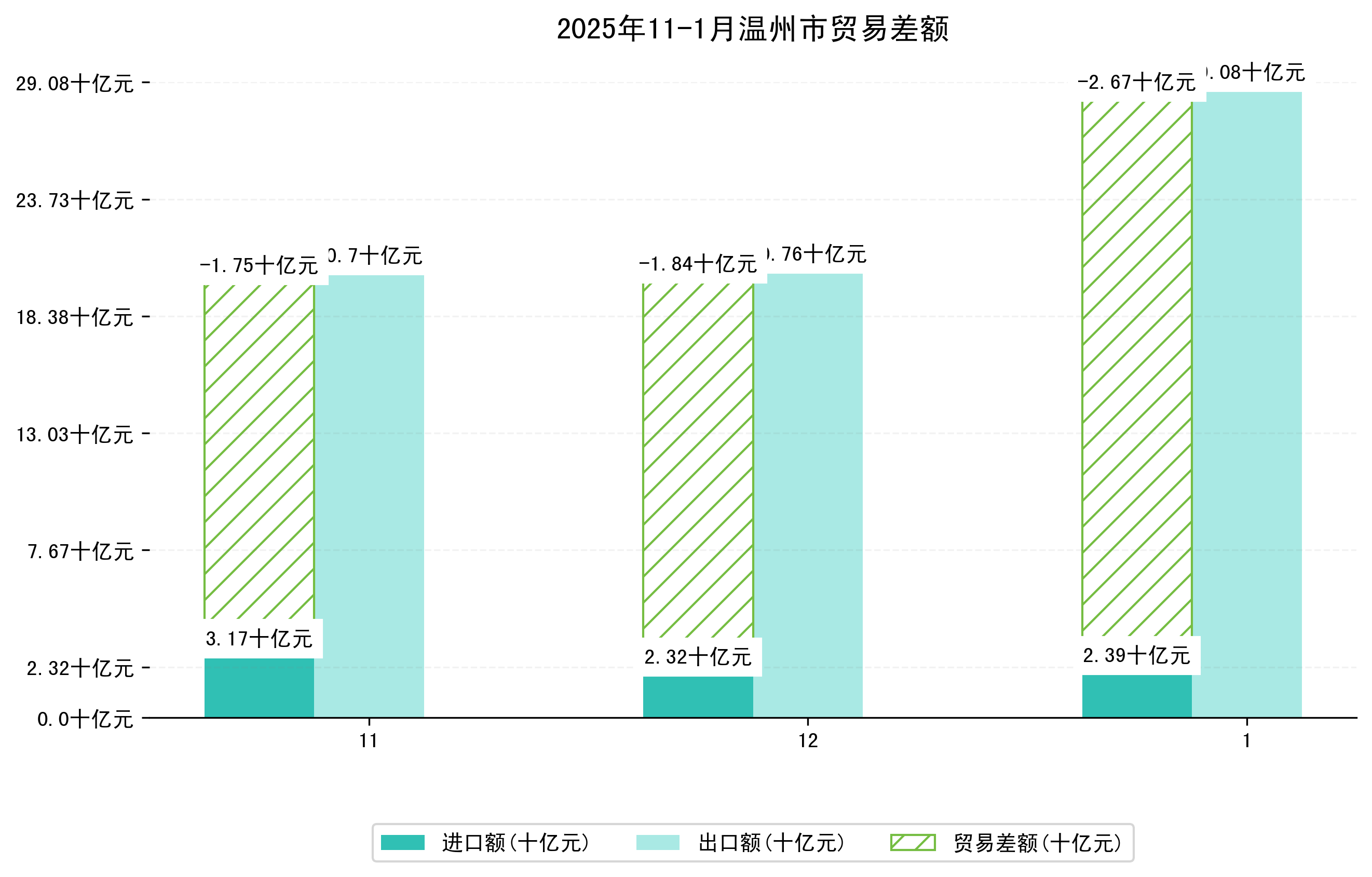 以美元计,2025年1-1月温州市贸易差额为37,1096,0739万美元(贸易顺差),相比上年同期增加了10,2732,9784万美元,同比增加38.28%。