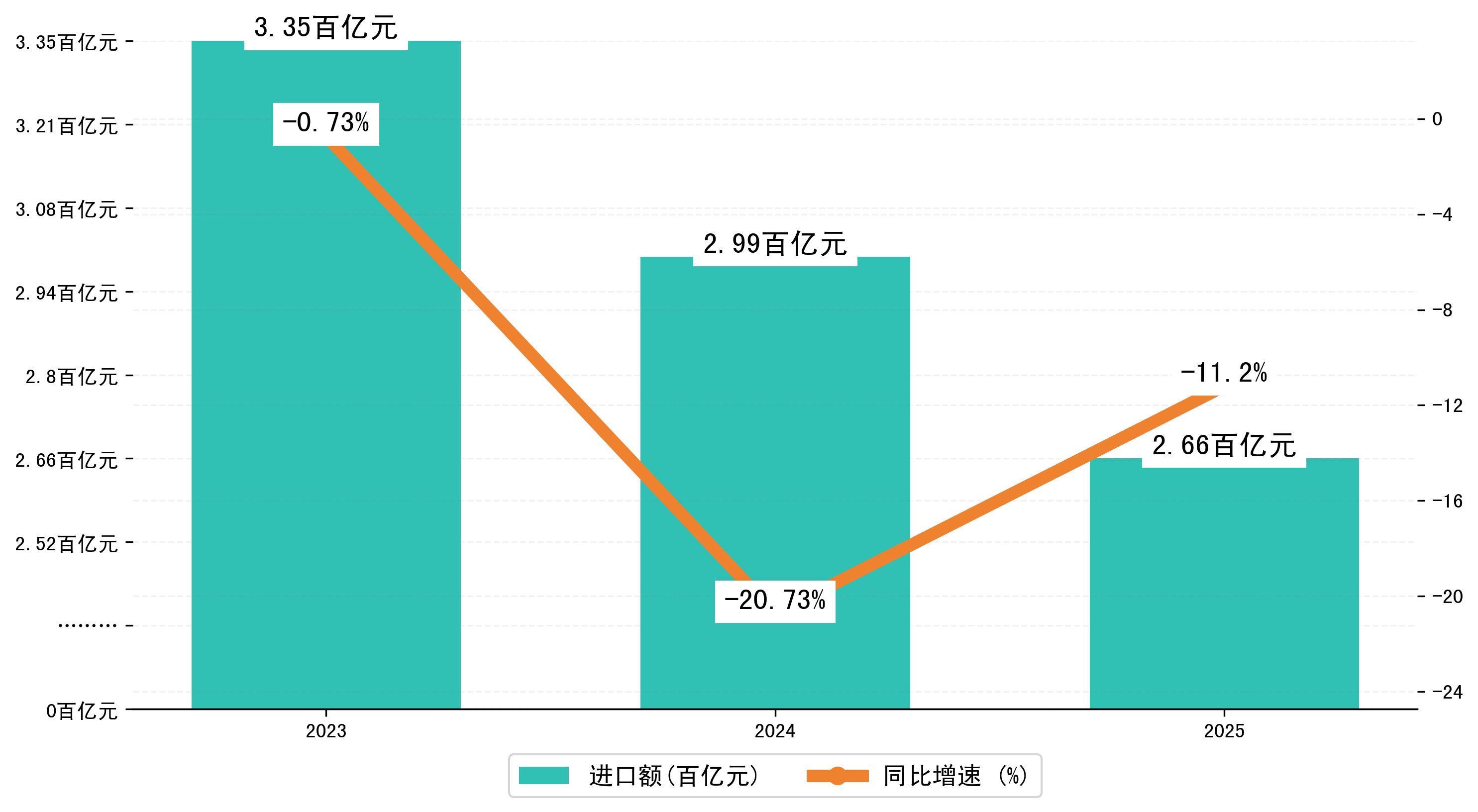 以人民币计,2025年1-8月温州市进口额为265,8412.7972万元,相比上年同期减少了33,5223.4246万元,同比减少了-11.00%。
