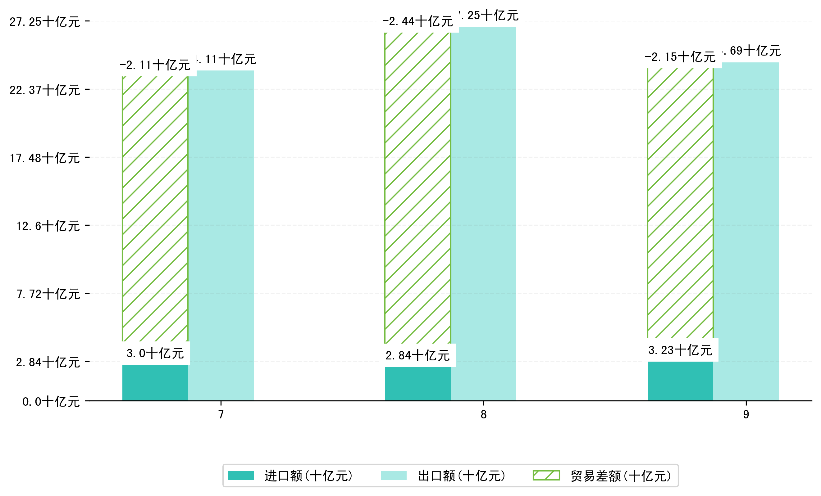 以人民币计,2025年9月温州市贸易差额为214,6167,1429万元(贸易顺差),相比上月减少了29,4170,1258万元,即4,0274,6985万美元;相比上年同期增加了25,5988,1409万元,同比增加13.54%。