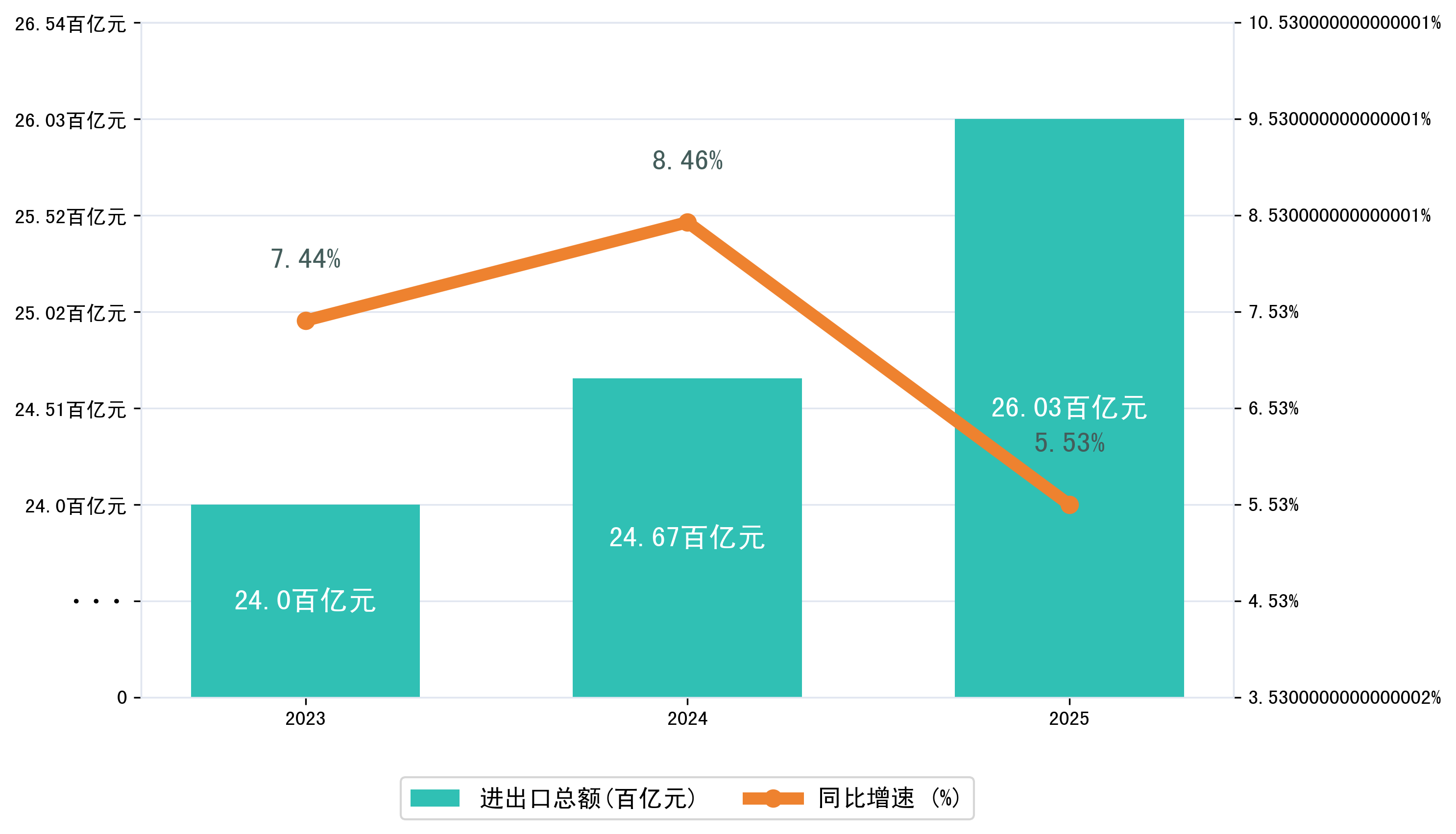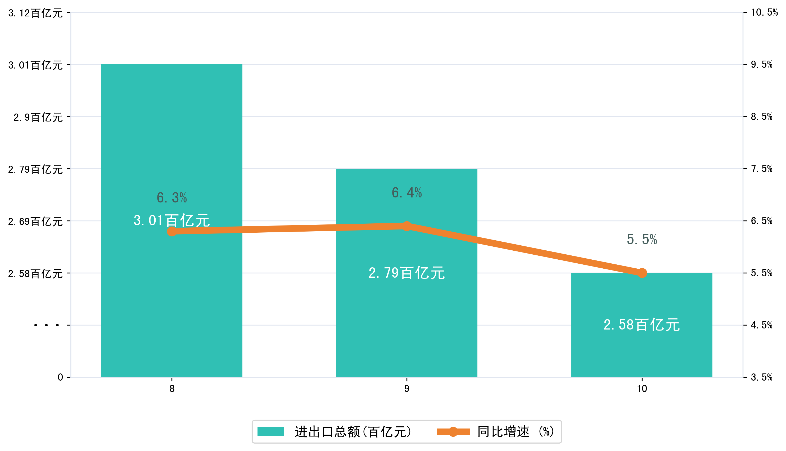以人民币计,2025年1-10月温州市进出口总额为2603,1908.0999万元,相比上年同期增加了136,3638.4244万元,同比增加了5.50%。
