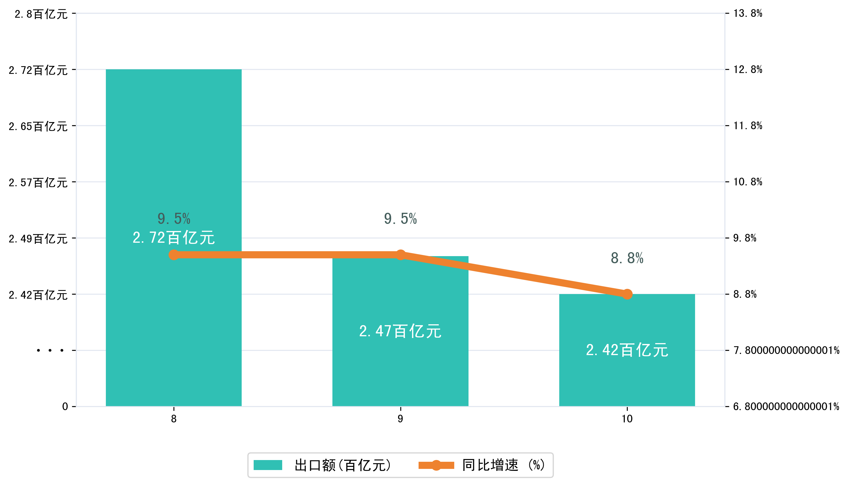 以人民币计,2025年10月温州市出口额为241,7568.9145万元,相比上月减少了5,1778.5534万元;相比上年同期增加了6,5517.0525万元,同比增加了8.80%。