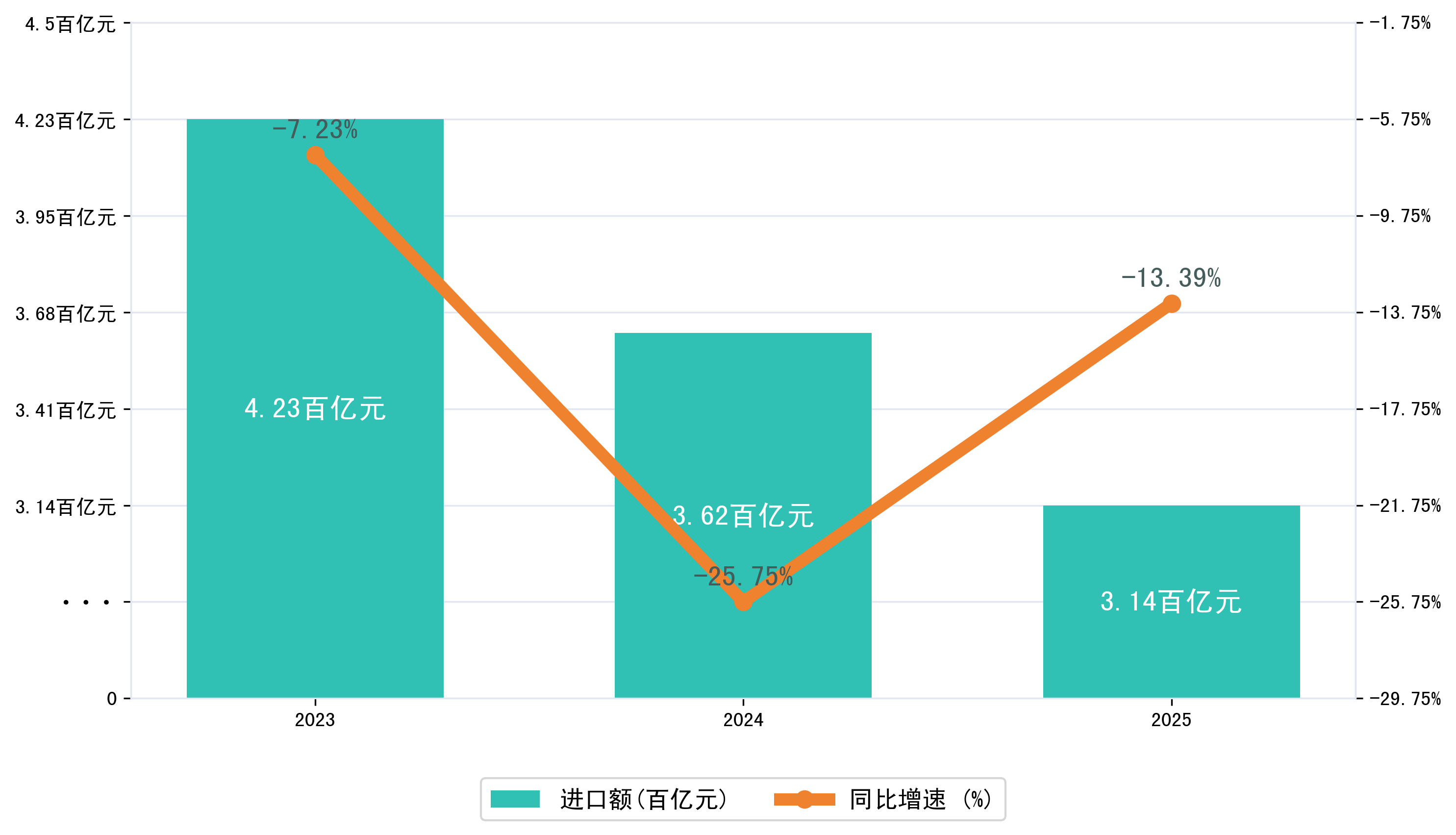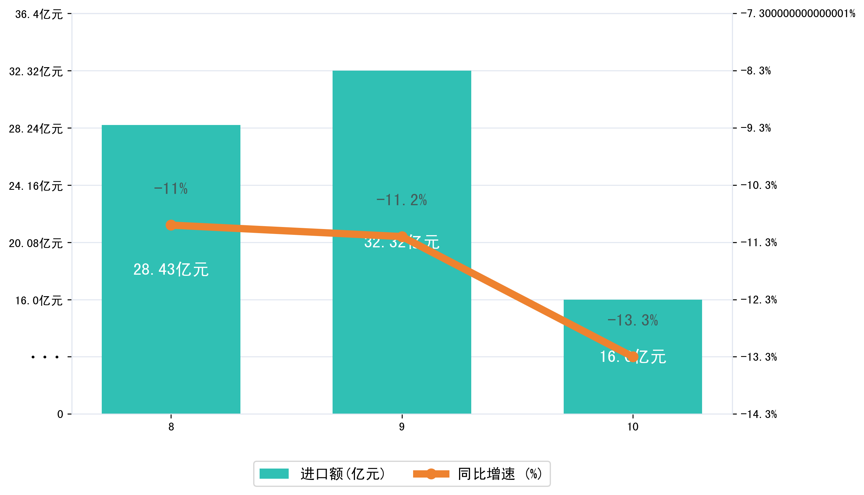 以人民币计,2025年1-10月温州市进口额为313,7879.5282万元,相比上年同期减少了48,5060.9726万元,同比减少了-13.30%。