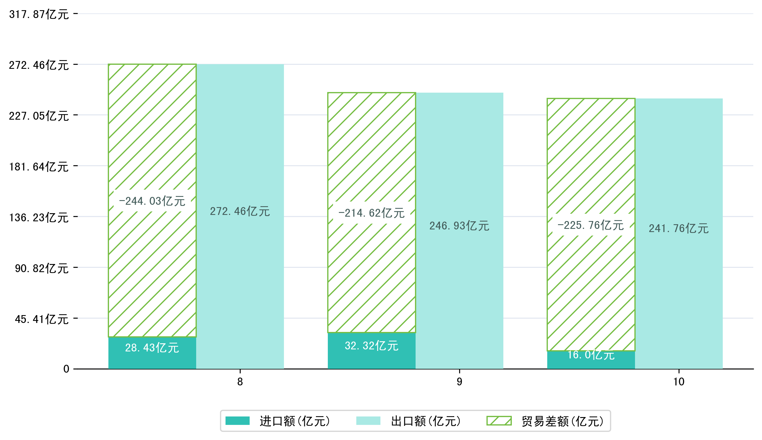 以人民币计,2025年10月温州市贸易差额为225,7567,7019万元(贸易顺差),相比上月增加了11,1400,5590万元,即1,6739,0809万美元;相比上年同期增加了17,2326,4208万元,同比增加8.26%。