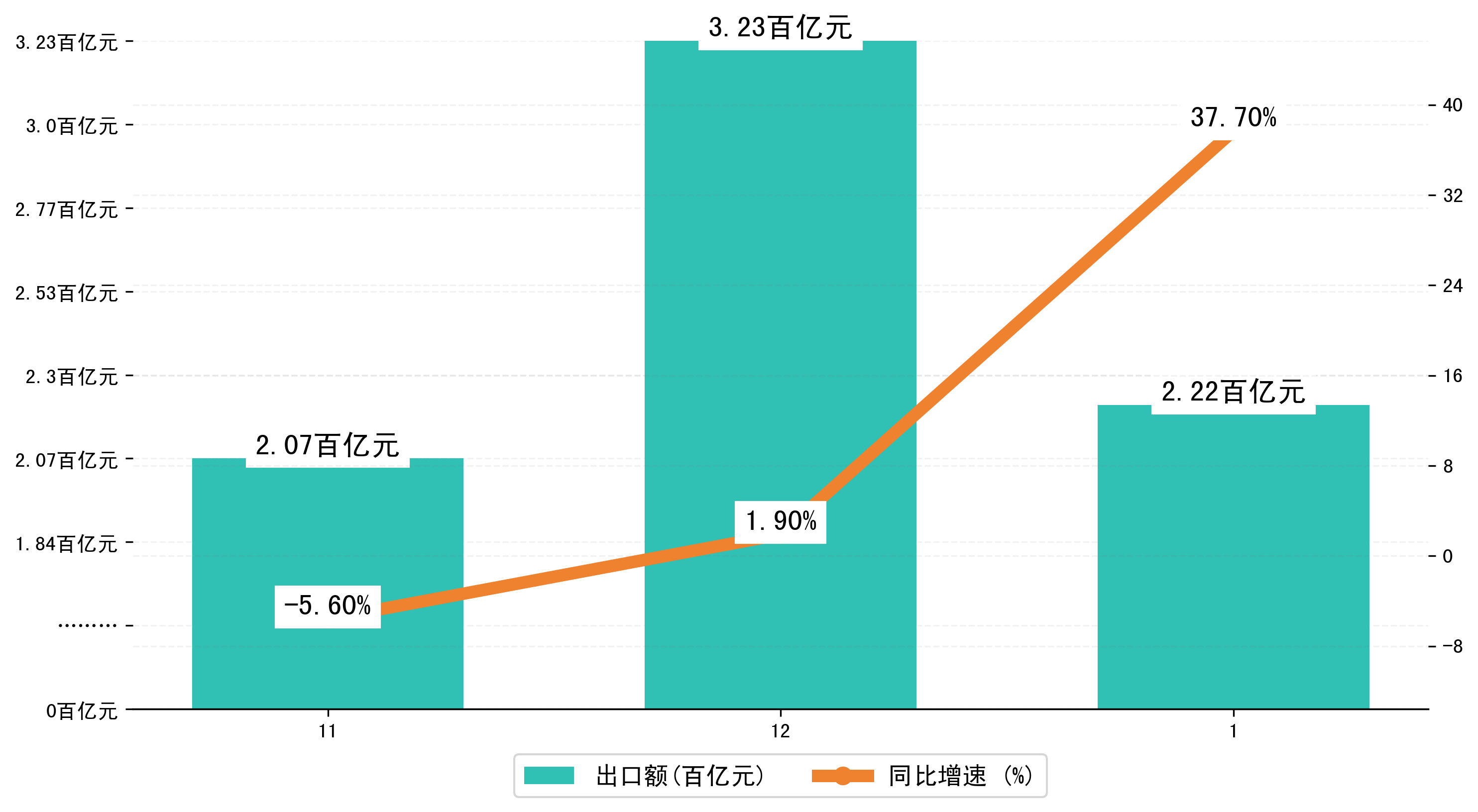 以人民币计,2024年1-1月武汉市出口额为222,0103.7699万元,相比上年同期增加了60,3250.9121万元,同比增加了37.70%。