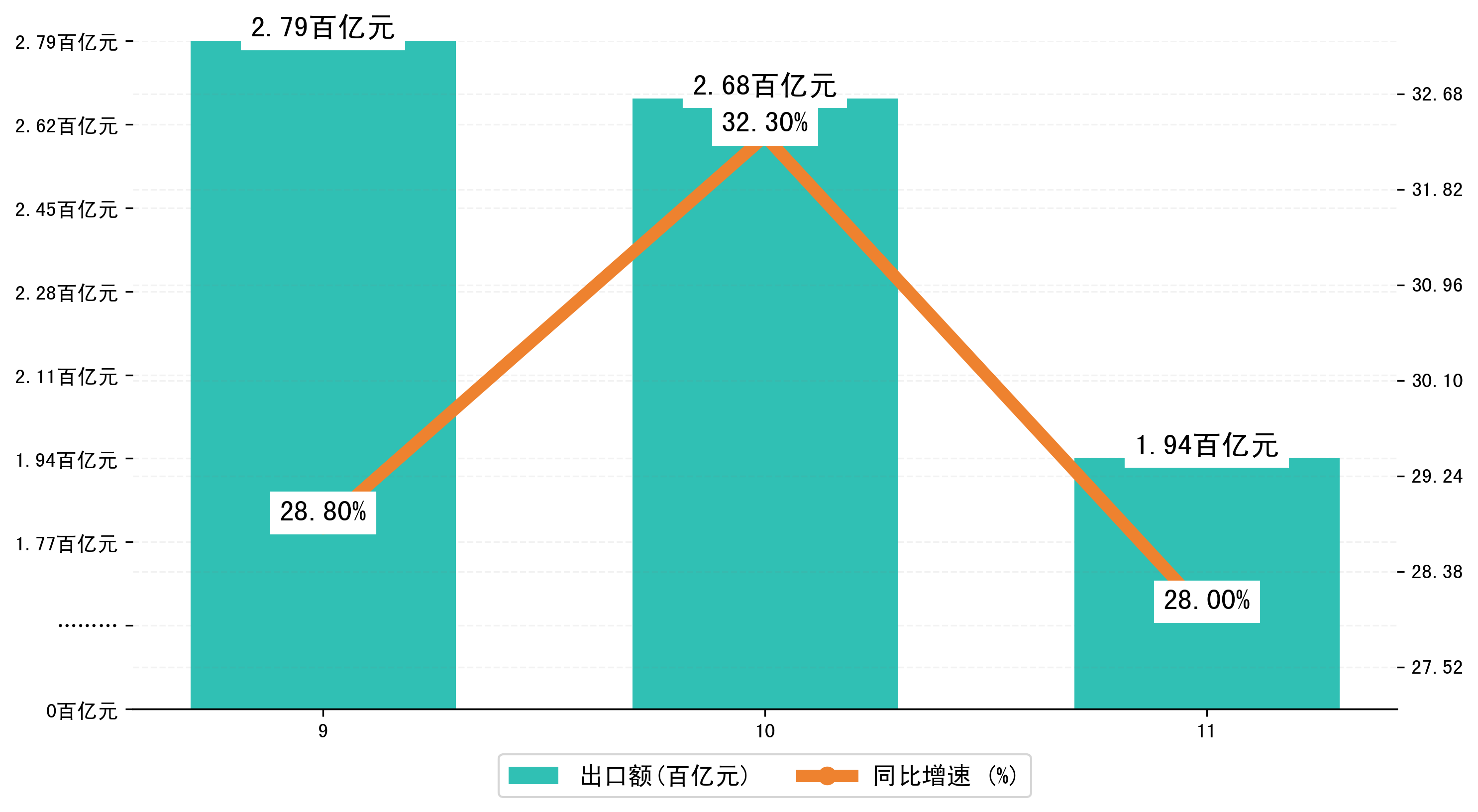 以人民币计,2024年11月武汉市出口额为194,2236.1537万元,相比上月减少了73,4377.5167万元;相比上年同期减少了12,9472.4507万元,同比增加了28.00%。