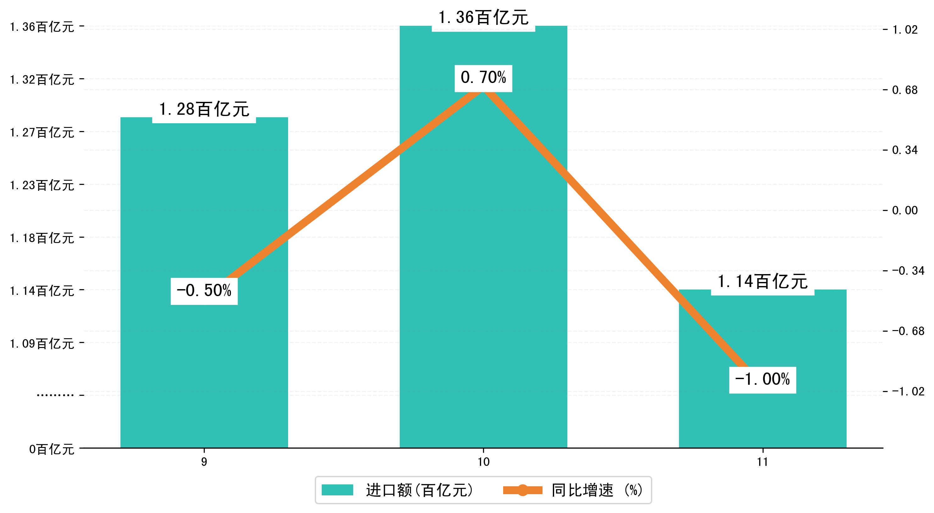 以人民币计,2024年11月武汉市进口额为113,7576.4153万元,相比上月减少了22,4096.9963万元;相比上年同期减少了20,5045.0946万元,同比减少了-1.00%。