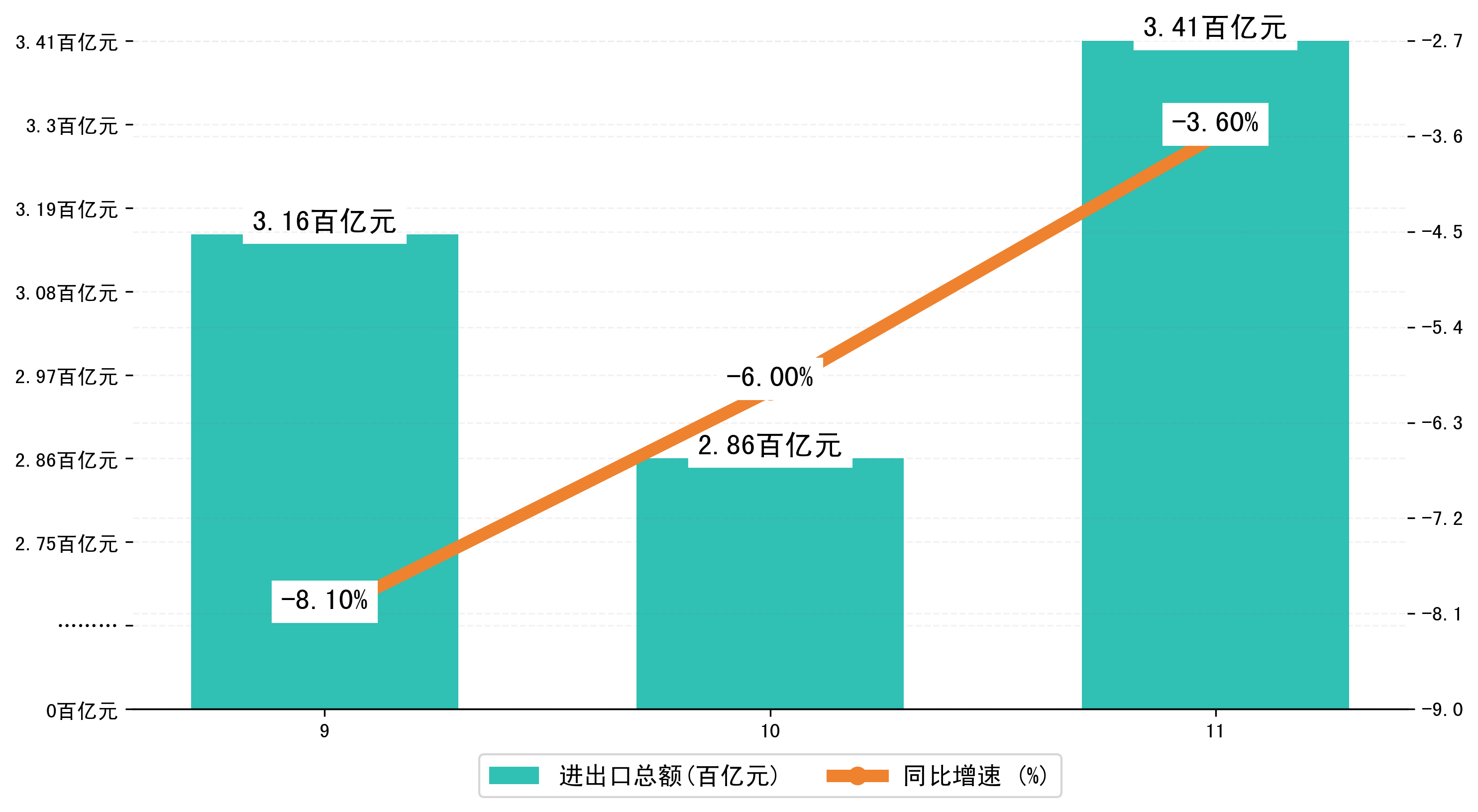 以人民币计,2023年11月武汉市进出口总额为341,4330.1143万元,相比上月增加了55,4387.518万元;相比上年同期增加了52,4035.4726万元,同比减少了-3.60%。