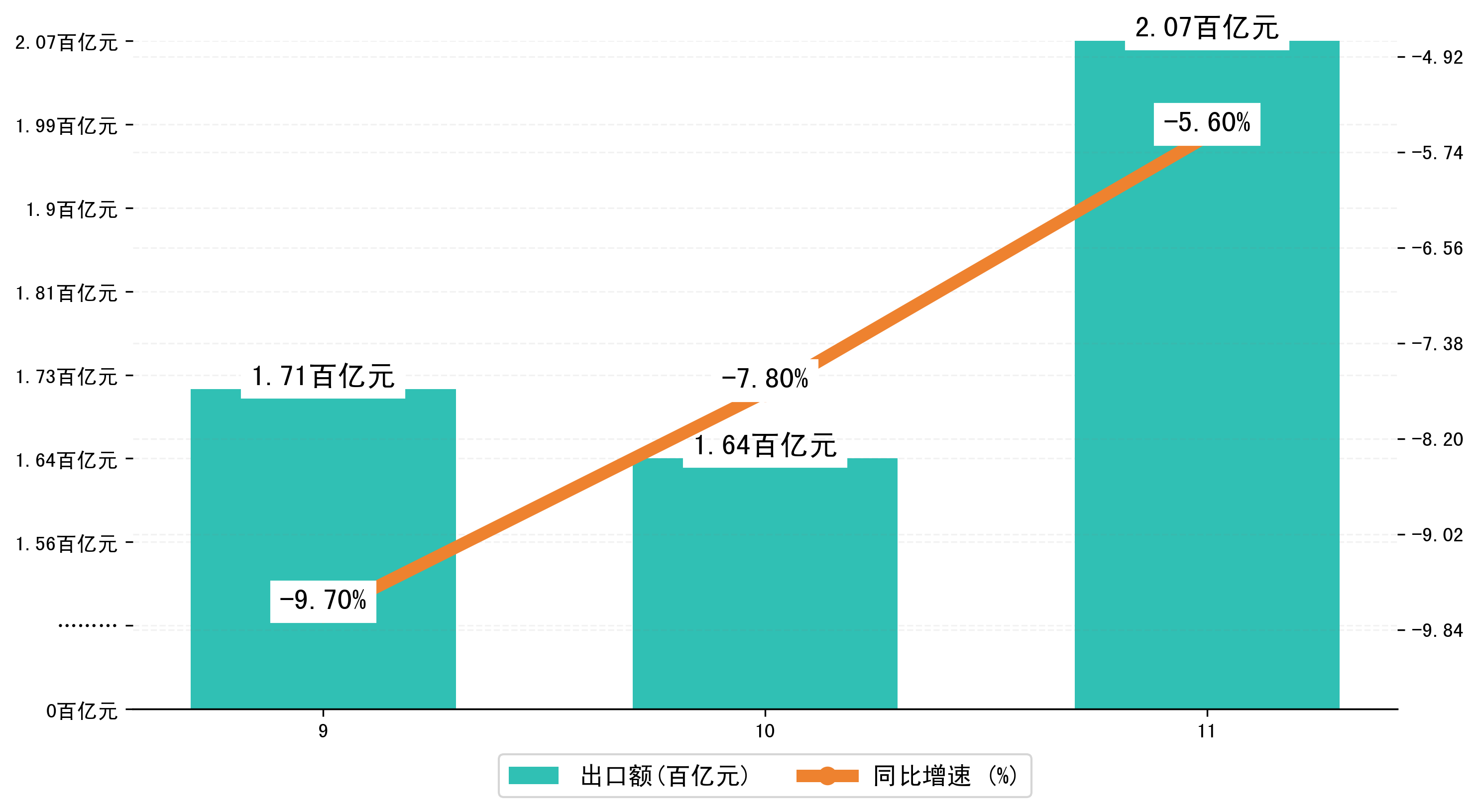 以人民币计,2023年11月武汉市出口额为207,1708.6044万元,相比上月增加了43,0530.8742万元;相比上年同期增加了19,6129.5761万元,同比减少了-5.60%。