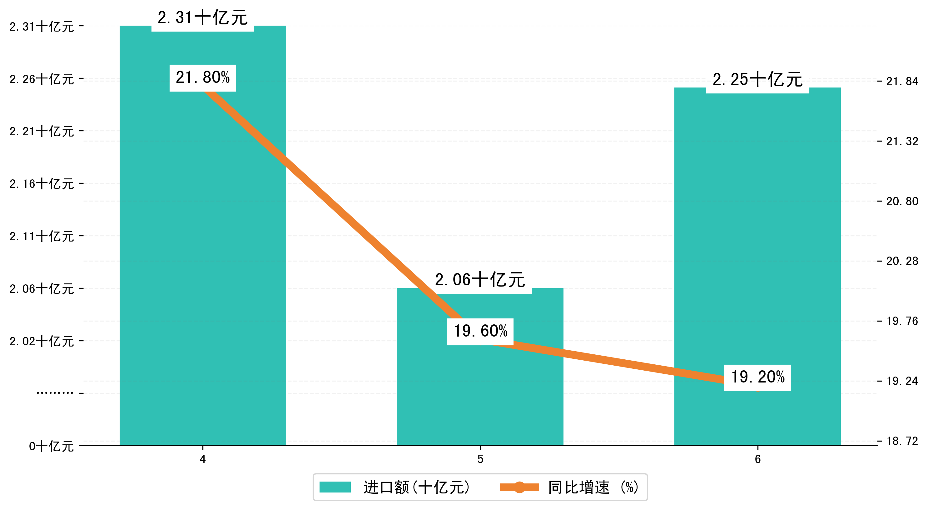 以人民币计,2024年6月芜湖市进口额为22,5375.4269万元,相比上月增加了1,8887.7324万元;相比上年同期增加了3,1551.9548万元,同比增加了19.20%。