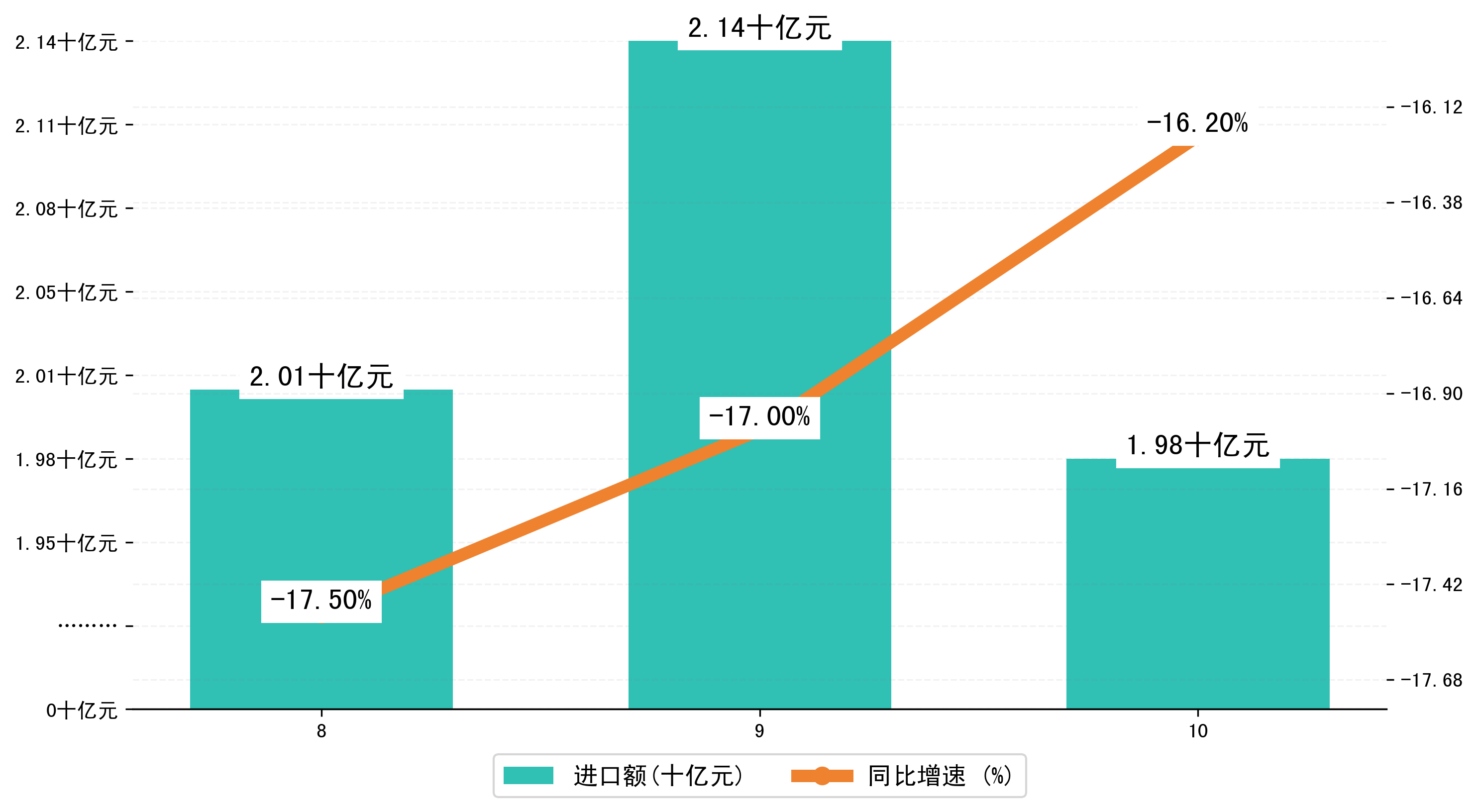 以人民币计,2023年10月芜湖市进口额为19,7931.5409万元,相比上月减少了1,6561.477万元;相比上年同期减少了1,8689.8481万元,同比减少了-16.20%。