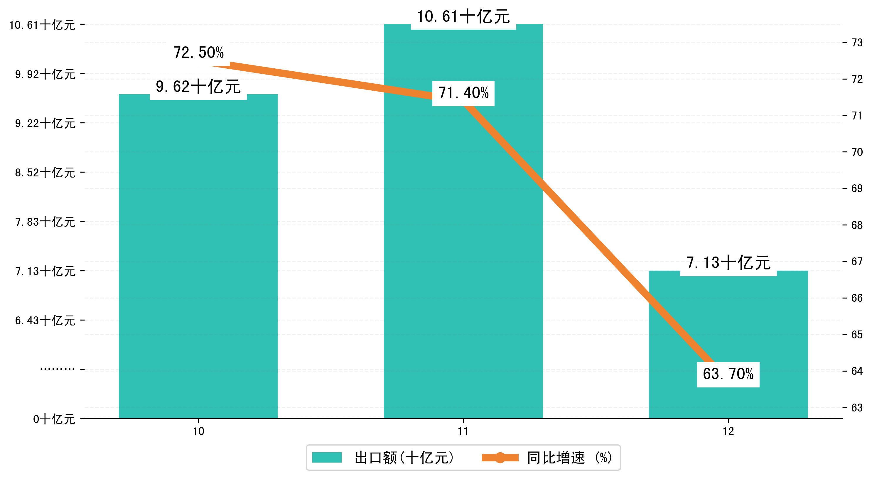 以美元计,2023年12月芜湖市出口额为9,9783.444万美元,相比上月减少了4,8598.8284万美元;相比上年同期增加了8758.6972万美元,同比增加55.10%。