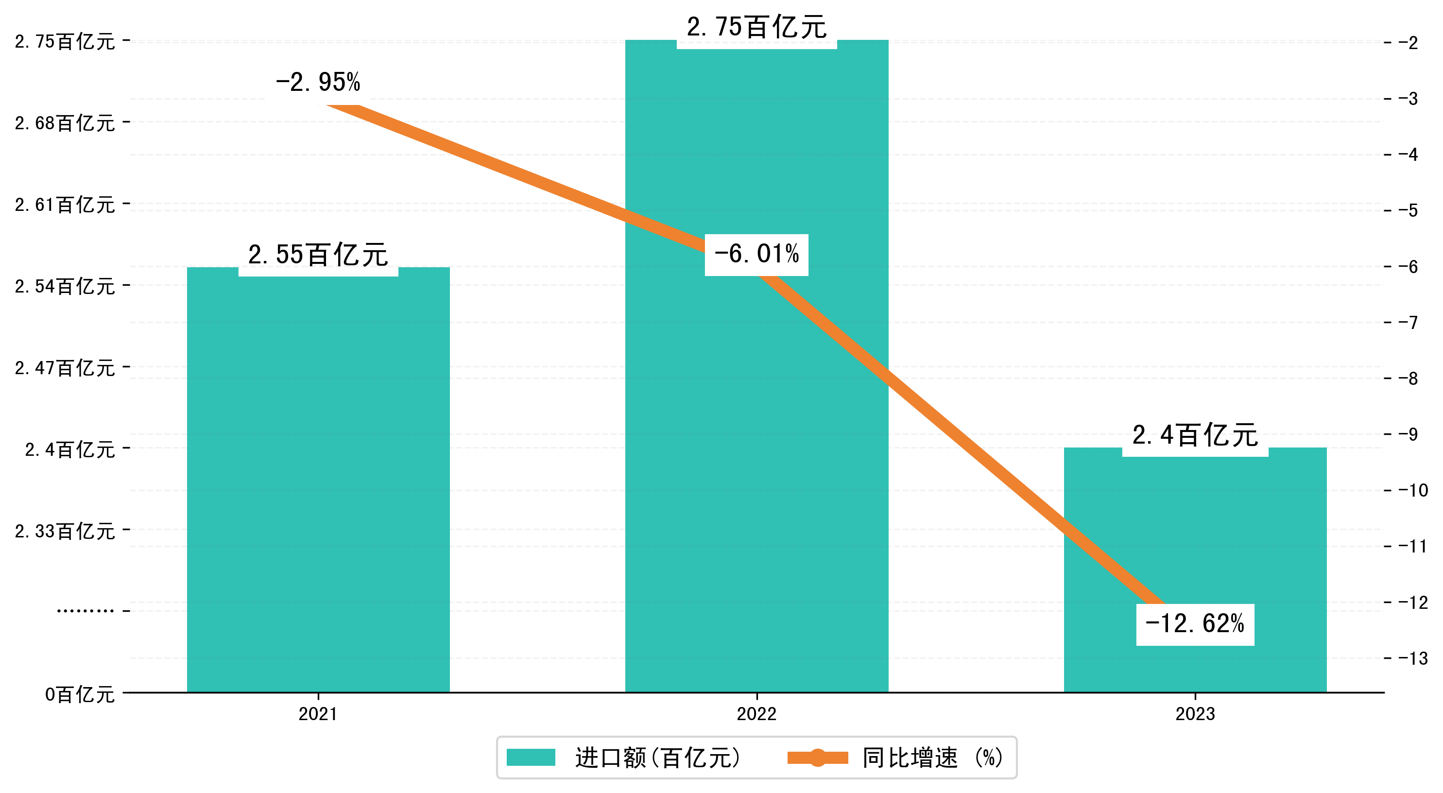 以人民币计,2023年1-12月芜湖市进口额为240,0193.9667万元,相比上年同期减少了34,6725.889万元,同比减少了-12.60%。