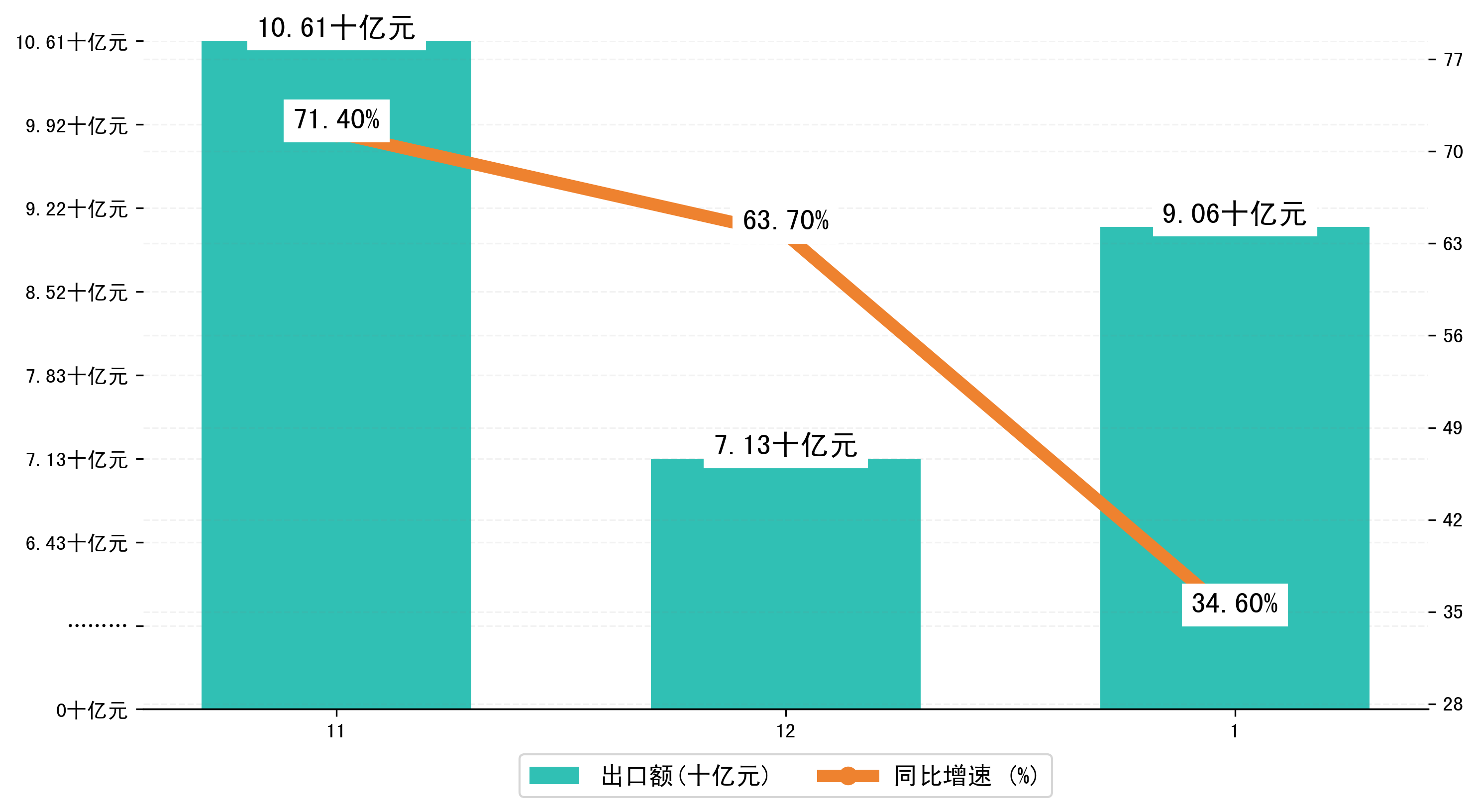 以人民币计,2024年1-1月芜湖市出口额为90,6130.645万元,相比上年同期增加了23,3010.3177万元,同比增加了34.60%。