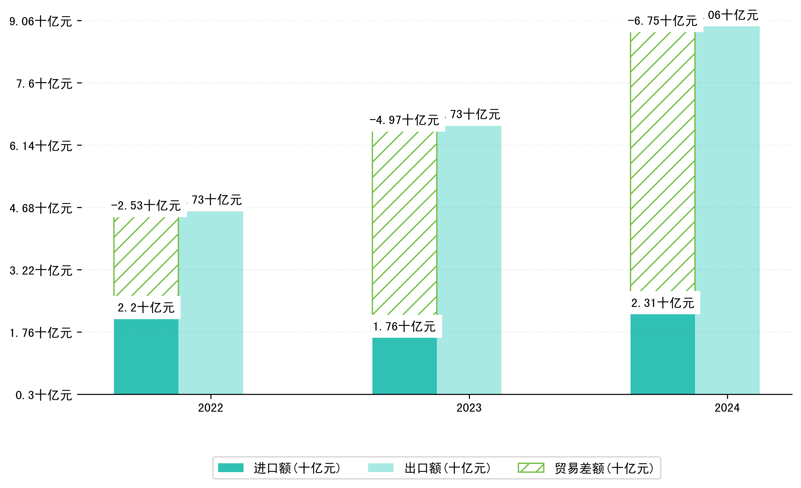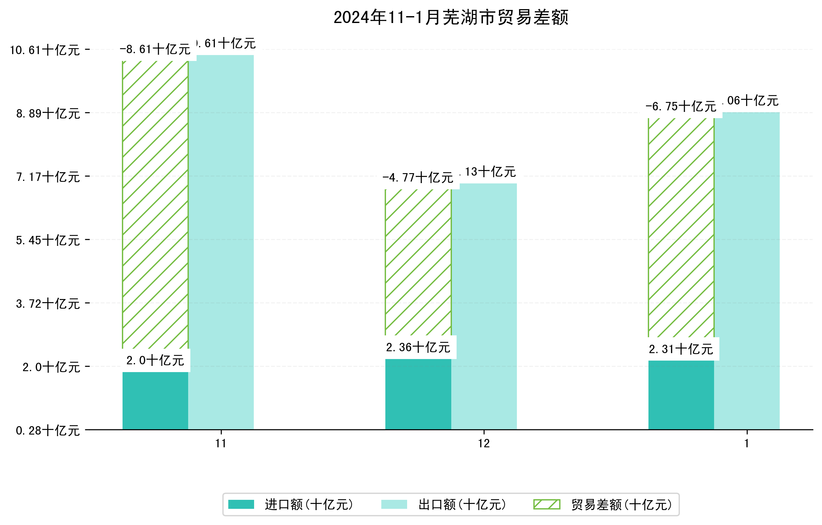 以美元计,2024年1-1月芜湖市贸易差额为9,5039,8961万美元(贸易顺差),相比上年同期增加了2,4170,1252万美元,同比增加34.1%。