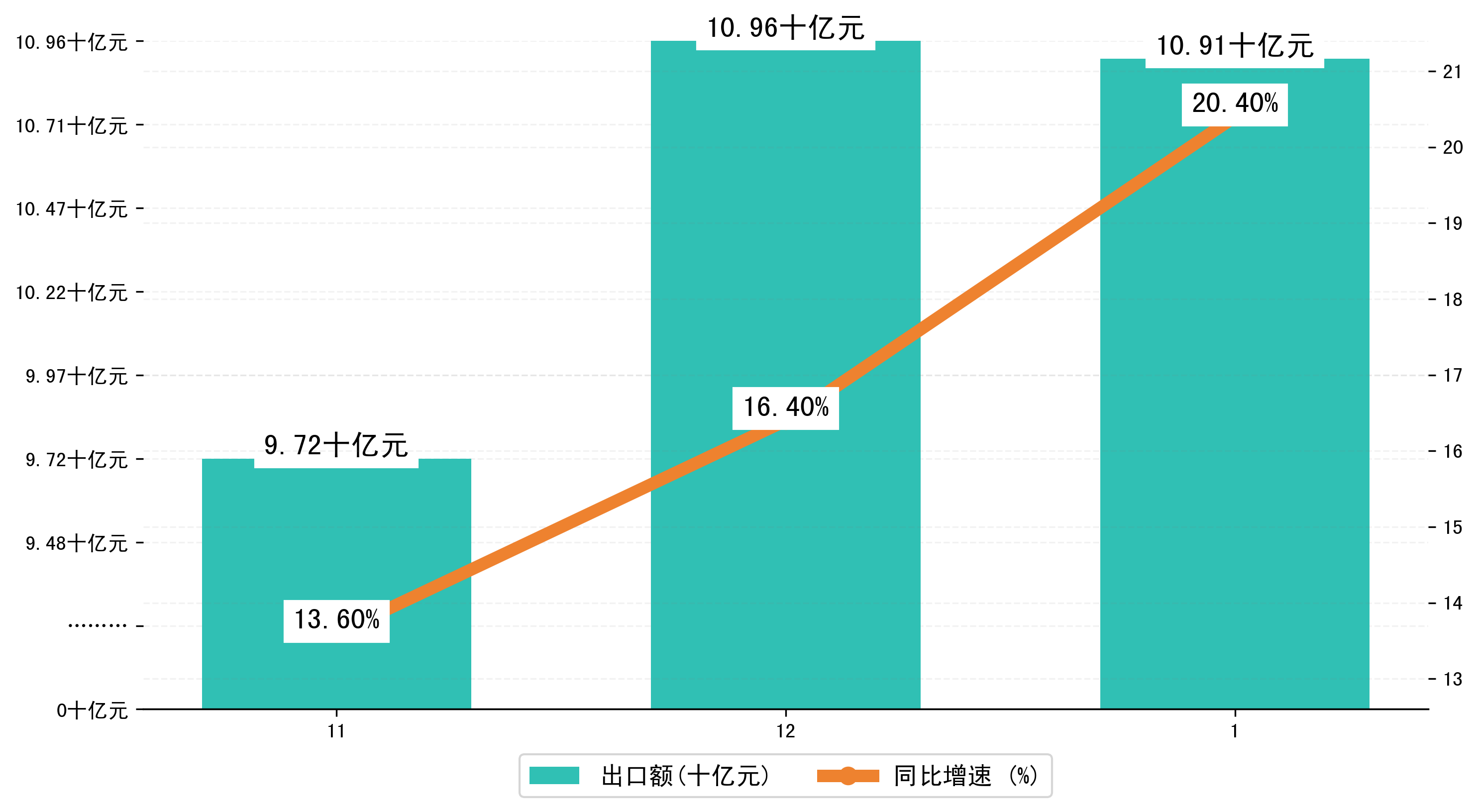以人民币计,2025年1-1月芜湖市出口额为109,0760.8367万元,相比上年同期增加了18,4630.1917万元,同比增加了20.40%。