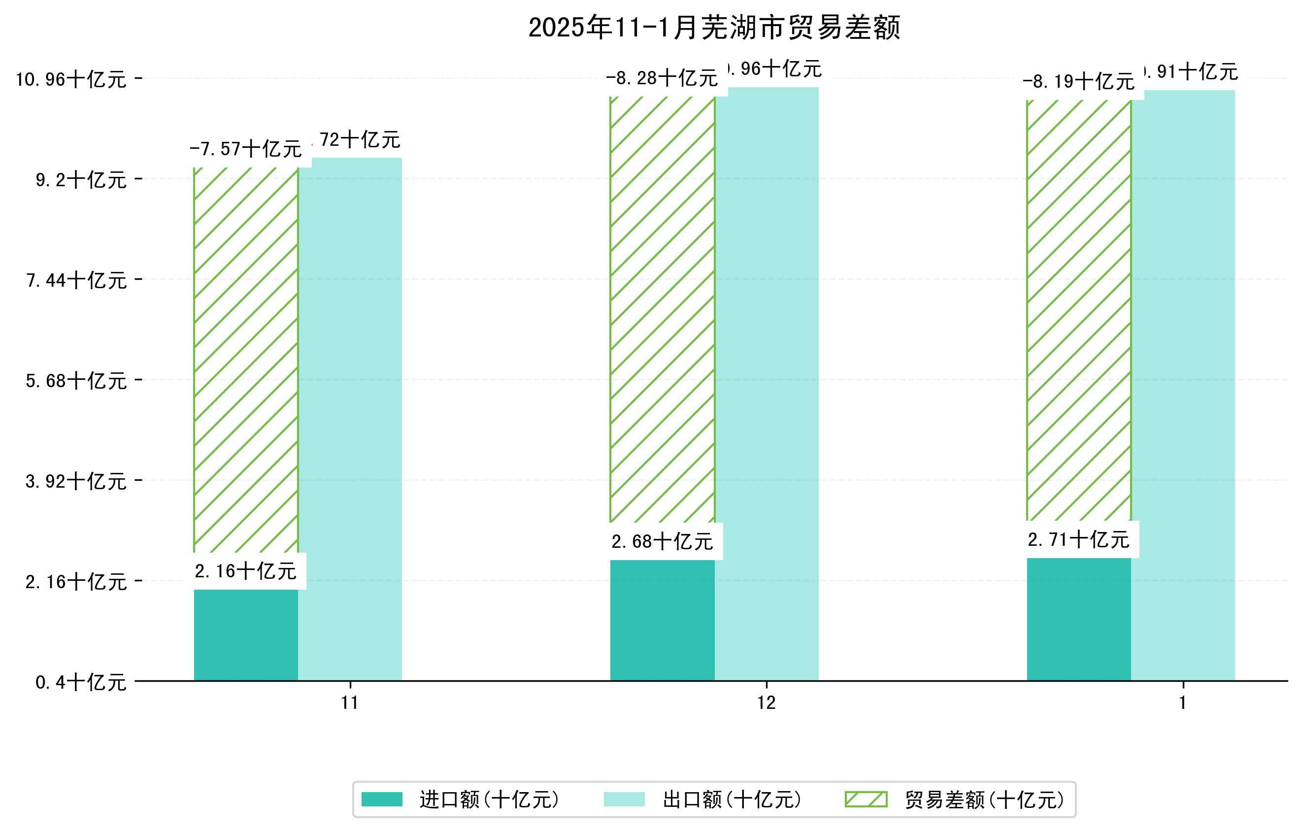 以美元计,2025年1-1月芜湖市贸易差额为11,3790,0703万美元(贸易顺差),相比上年同期增加了1,8750,1742万美元,同比增加19.73%。