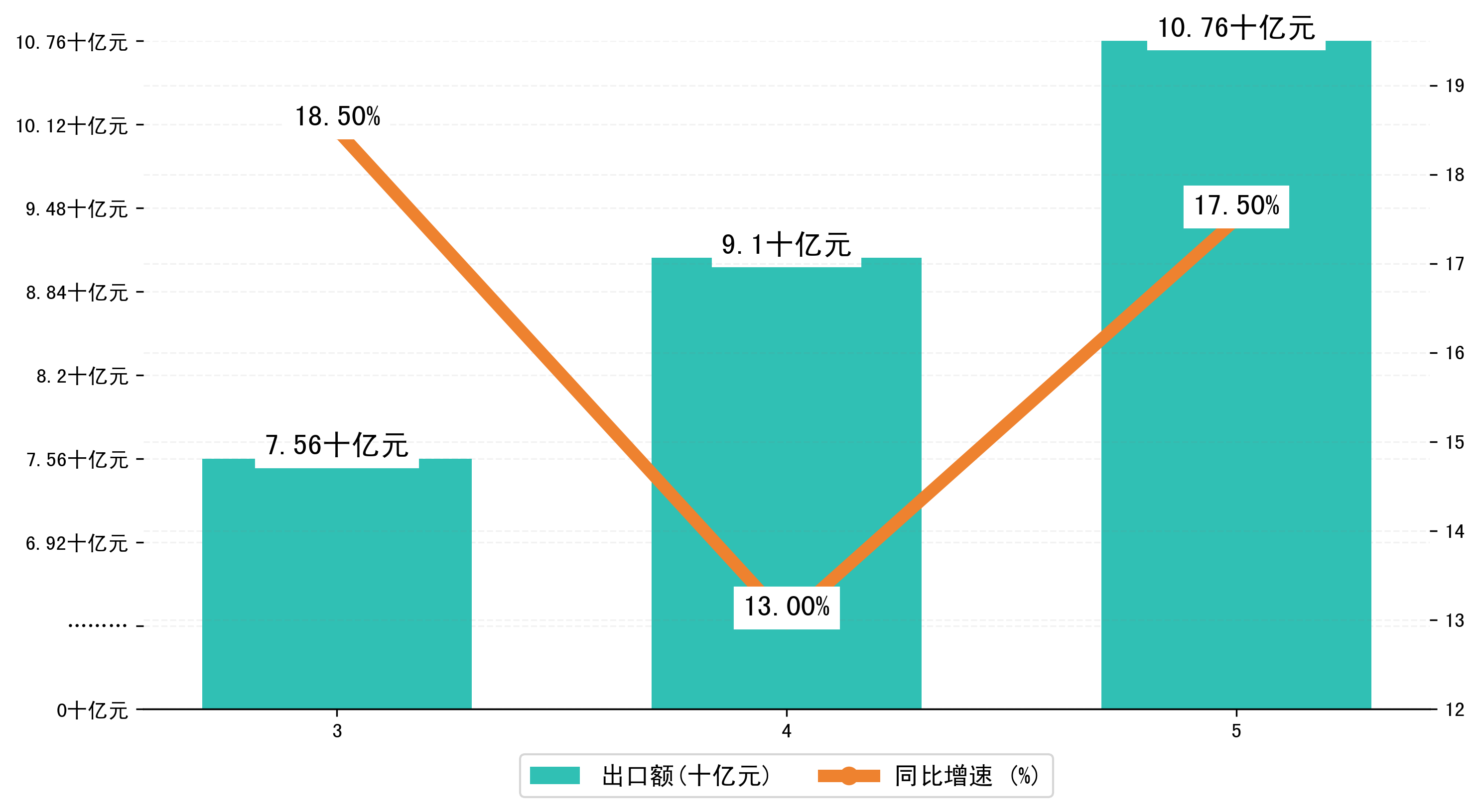 以人民币计,2024年1-5月芜湖市出口额为447,8781.754万元,相比上年同期增加了60,0301.052万元,同比增加了17.50%。