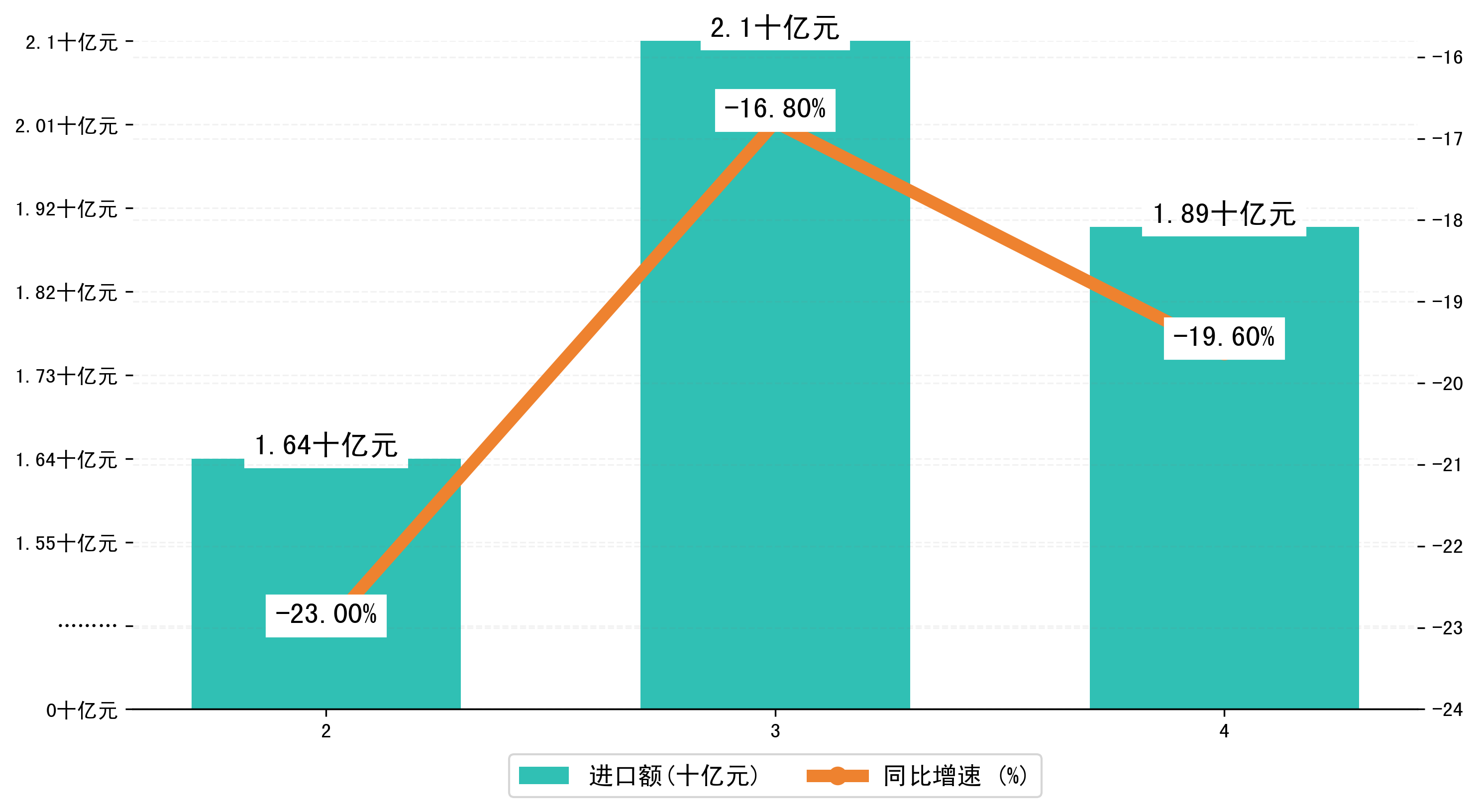 以人民币计,2023年1-4月芜湖市进口额为74,0573.4763万元,相比上年同期减少了17,5537.4215万元,同比减少了-19.60%。
