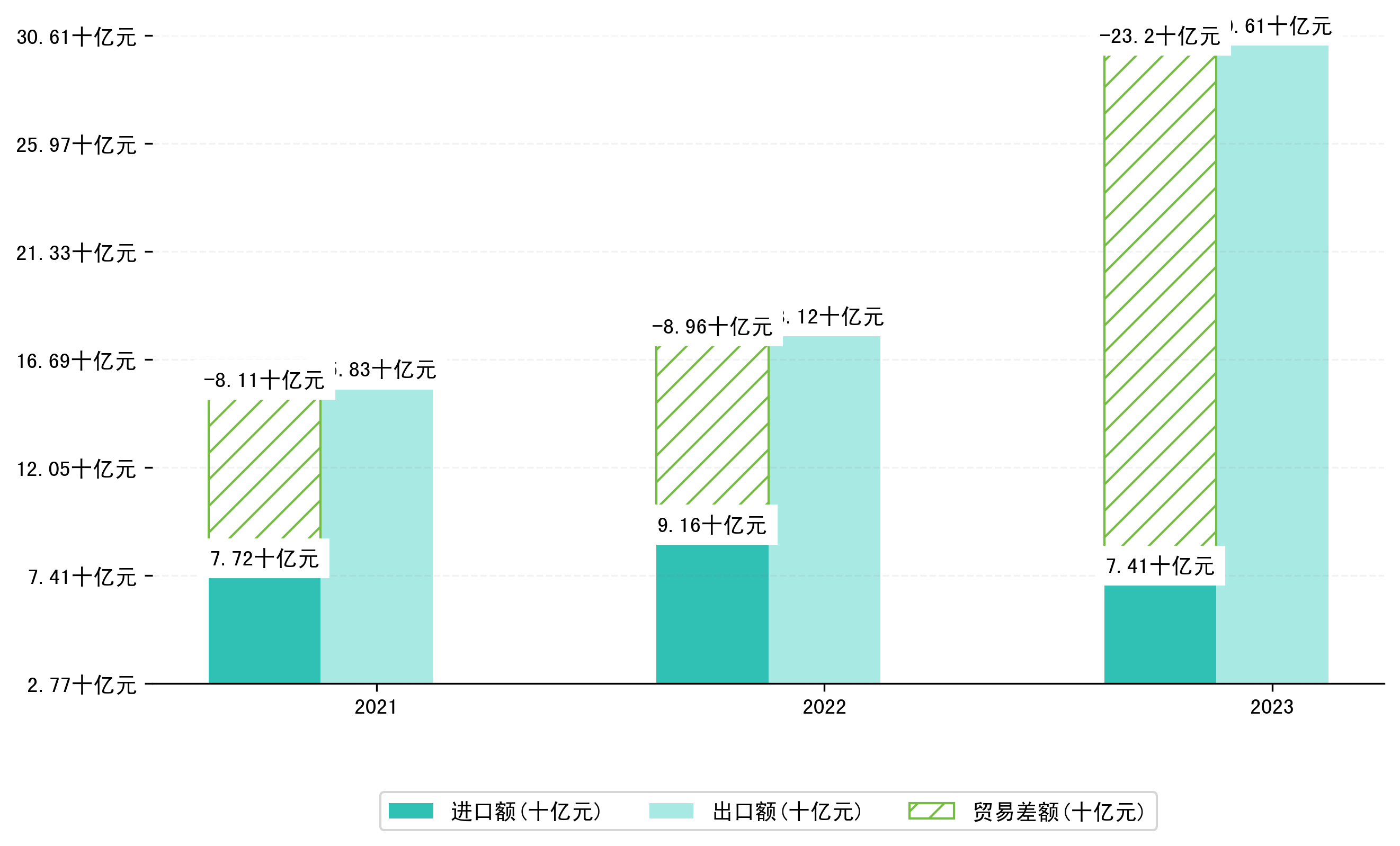 以美元计,2023年4月芜湖市贸易差额为11,1464,9976万美元(贸易顺差),相比上月增加了2,2690,6764万美元;相比上年同期增加了8,3517,3045万美元,同比增加298.83%。