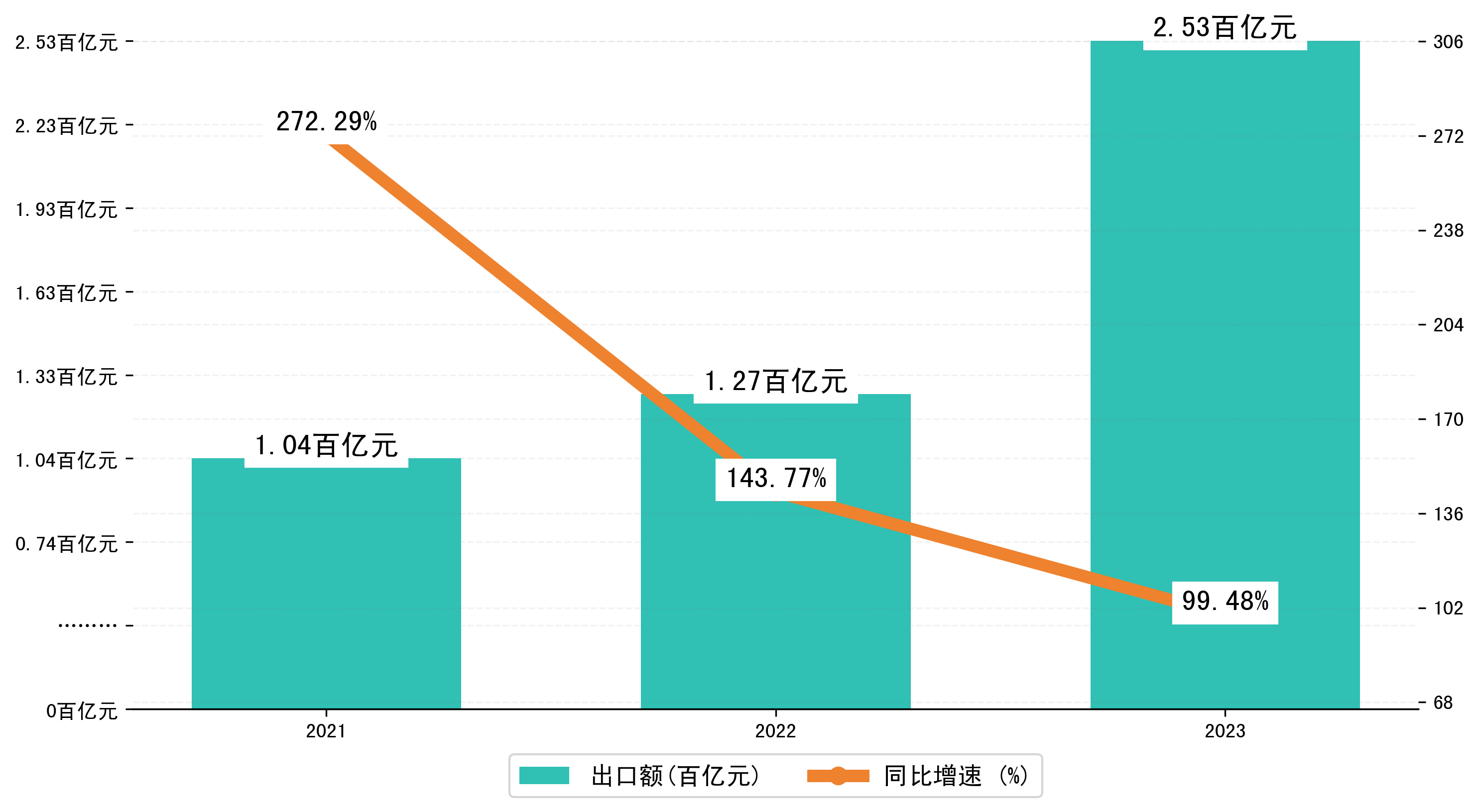 以人民币计,2023年1-5月乌鲁木齐市出口额为252,6830.1028万元,相比上年同期增加了126,0122.0814万元,同比增加了99.50%。