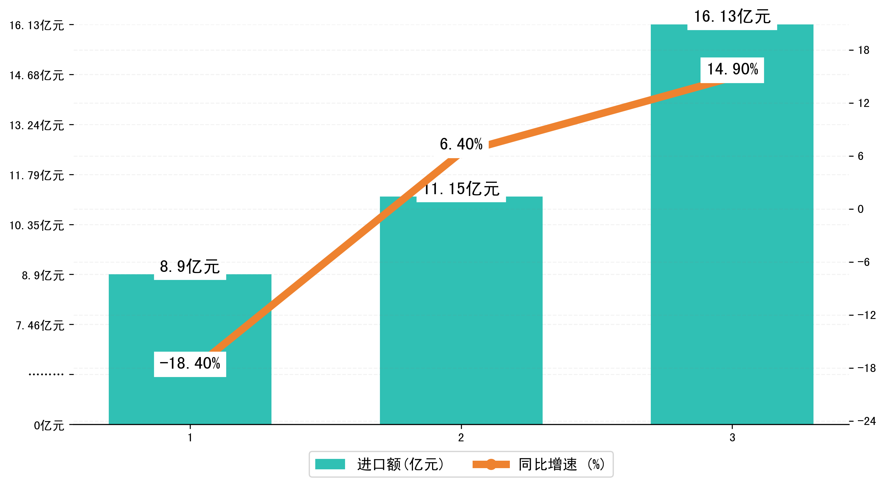 以美元计,2024年3月乌鲁木齐市进口额为2,2702.6126万美元,相比上月增加了7021.4477万美元;相比上年同期增加了3893.421万美元,同比增加11.10%。