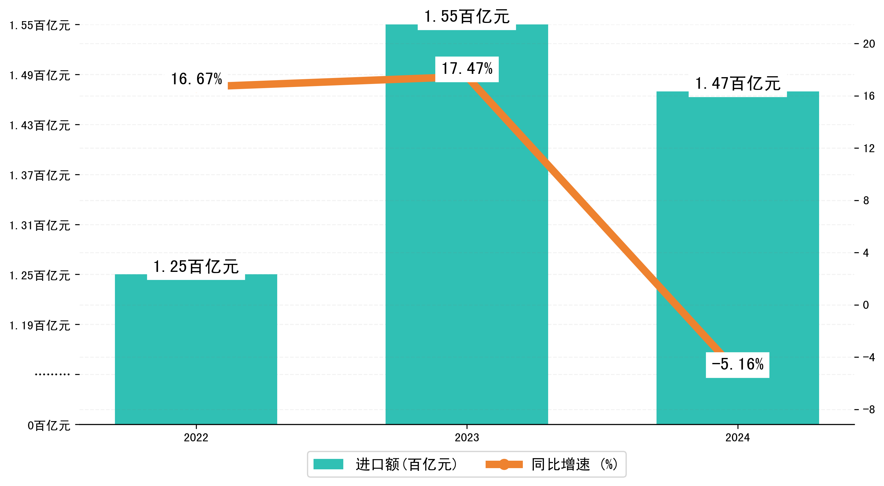 以人民币计,2024年1-12月乌鲁木齐市进口额为146,5939.9756万元,相比上年同期减少了7,9815.8632万元,同比减少了-4.90%。