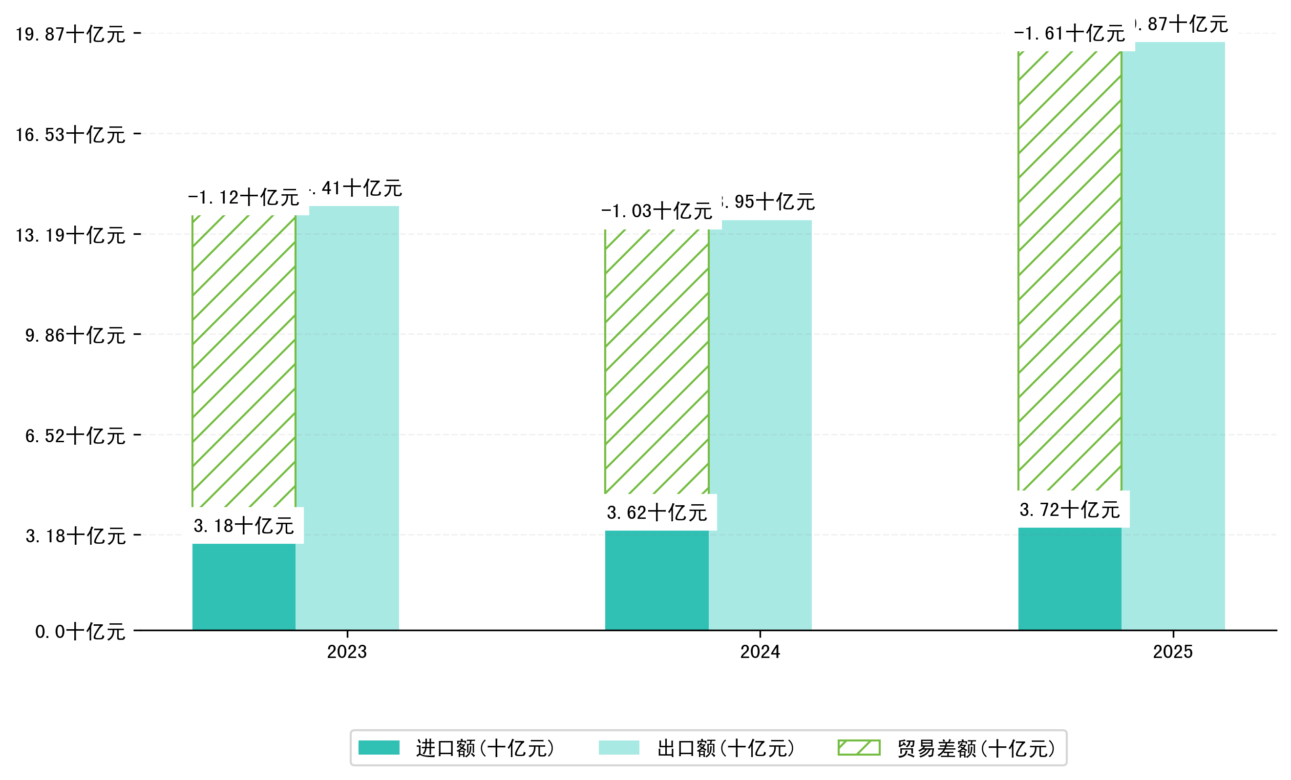 以人民币计,2025年1-3月乌鲁木齐市贸易差额为161,4846,7510万元(贸易顺差),相比上年同期增加了58,1342,3291万元,同比增加56.25%。
