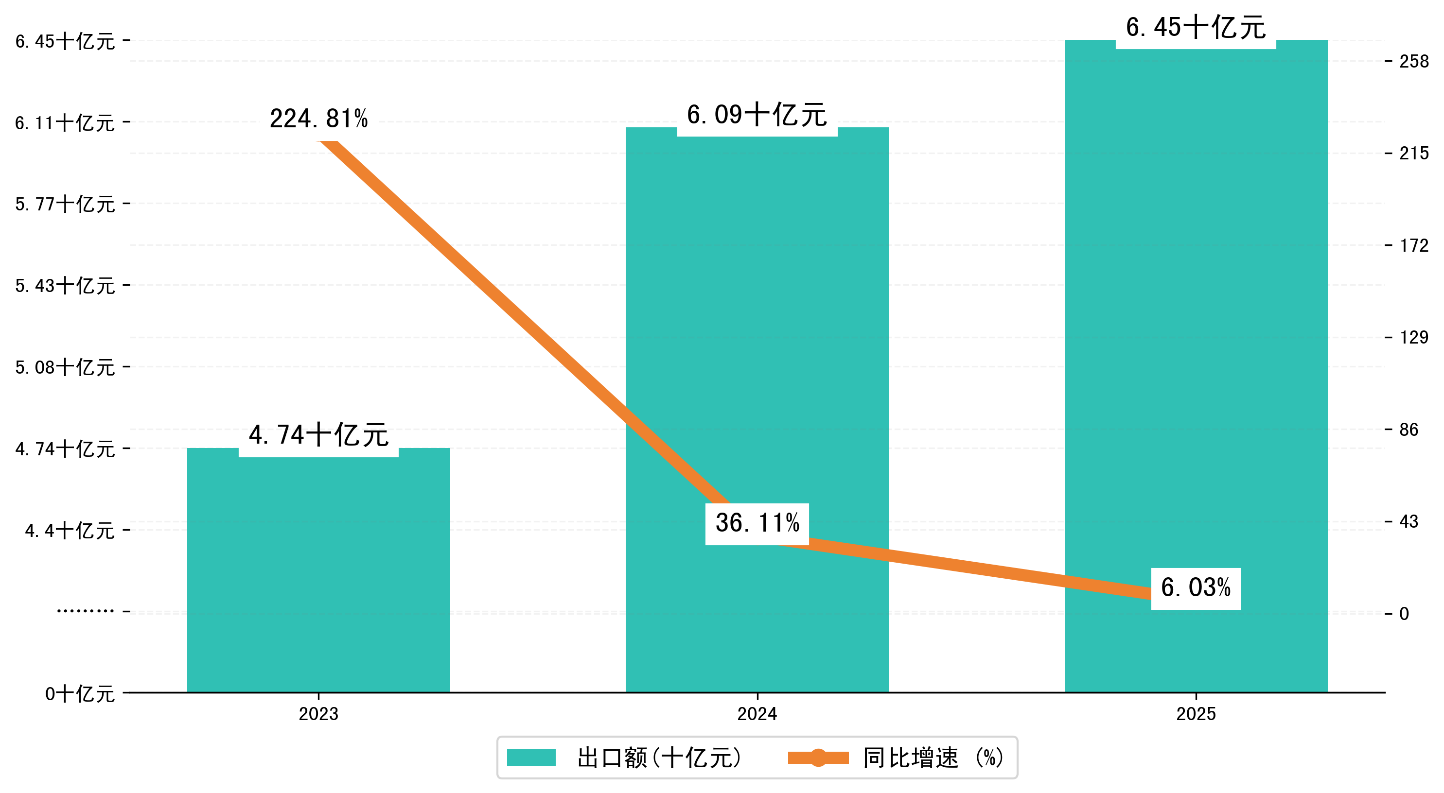 以人民币计,2025年1-1月乌鲁木齐市出口额为64,5412.6755万元,相比上年同期增加了3,6700.5664万元,同比增加了6.10%。