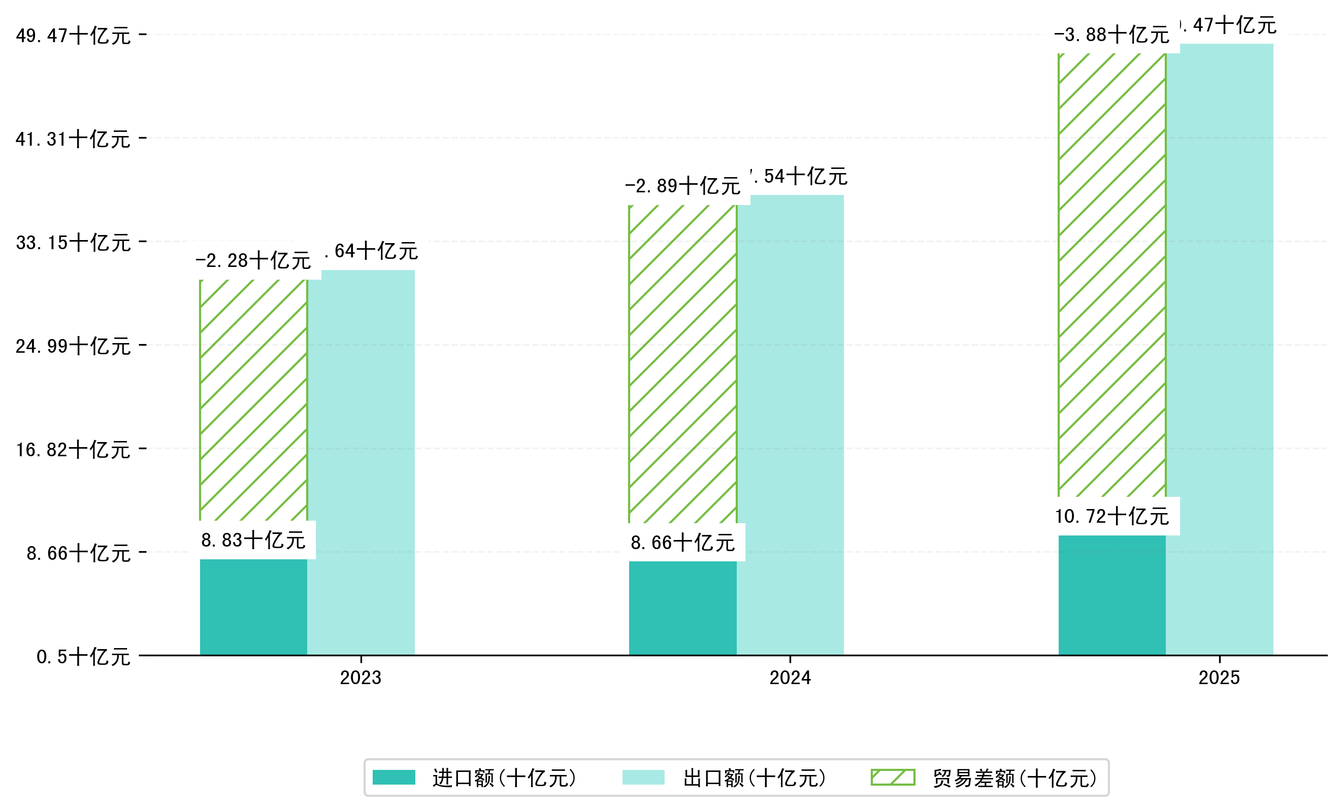 以人民币计,2025年1-7月乌鲁木齐市贸易差额为387,5190,3108万元(贸易顺差),相比上年同期增加了98,7480,6960万元,同比增加34.2%。