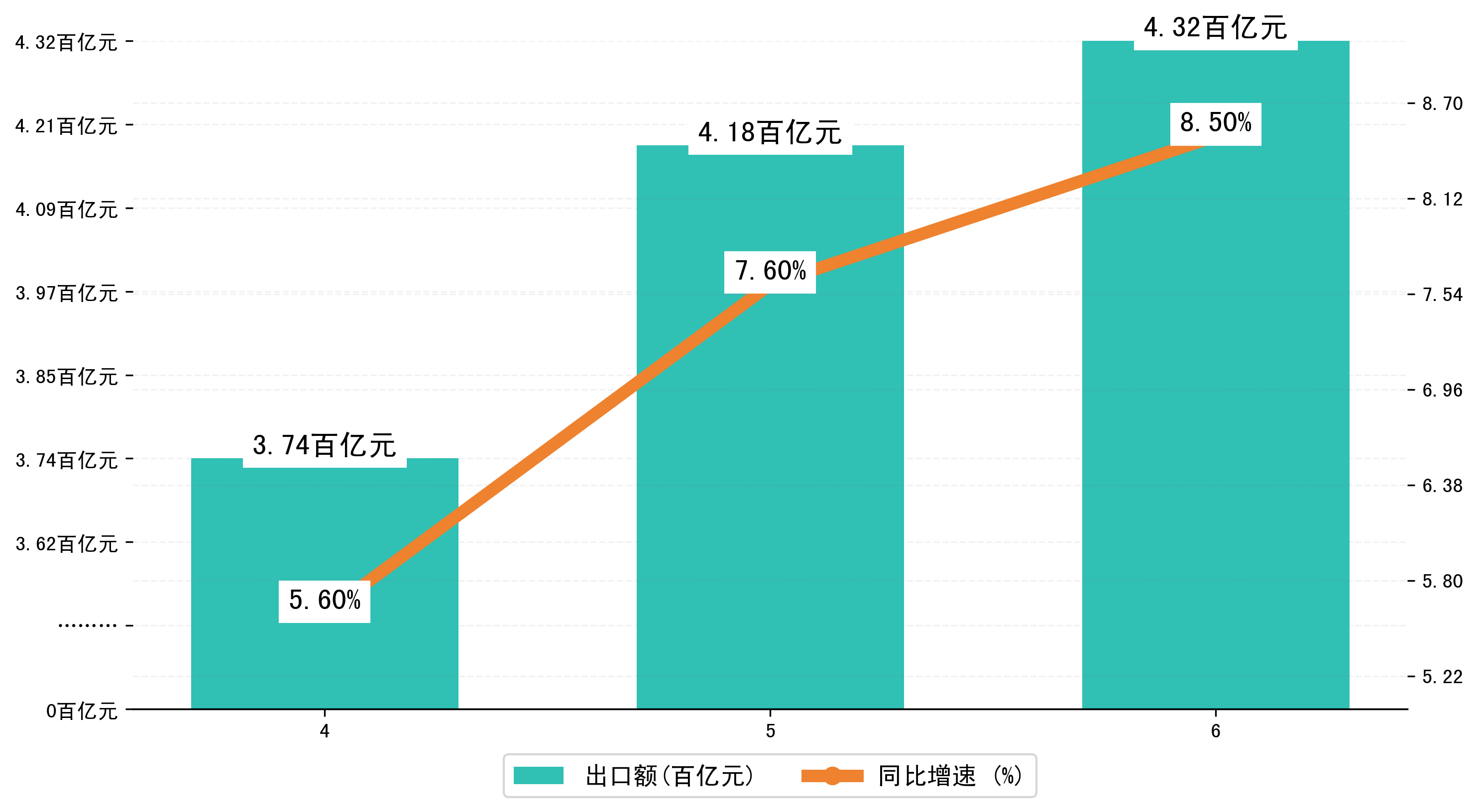 以美元计,2024年1-6月无锡市出口额为332,8908.8524万美元,相比上年同期增加了16,2977.1497万美元,同比增加5.20%。