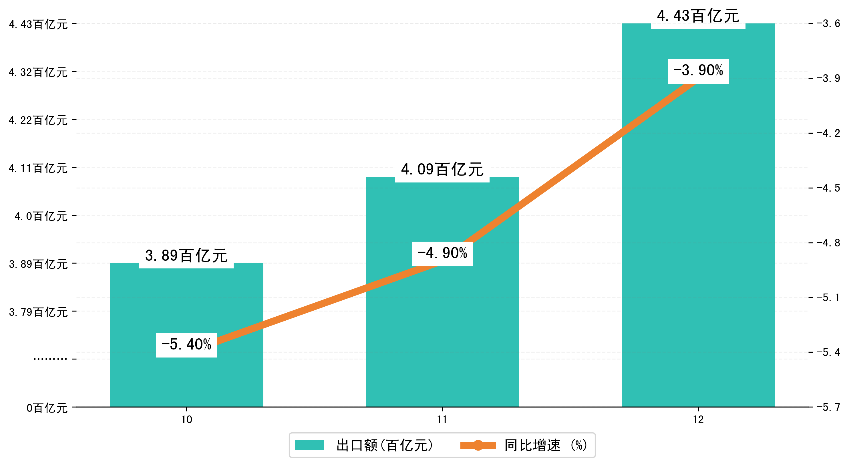 以人民币计,2023年12月无锡市出口额为443,2310.8831万元,相比上月增加了34,4933.2431万元;相比上年同期增加了26,2455.0834万元,同比减少了-3.90%。