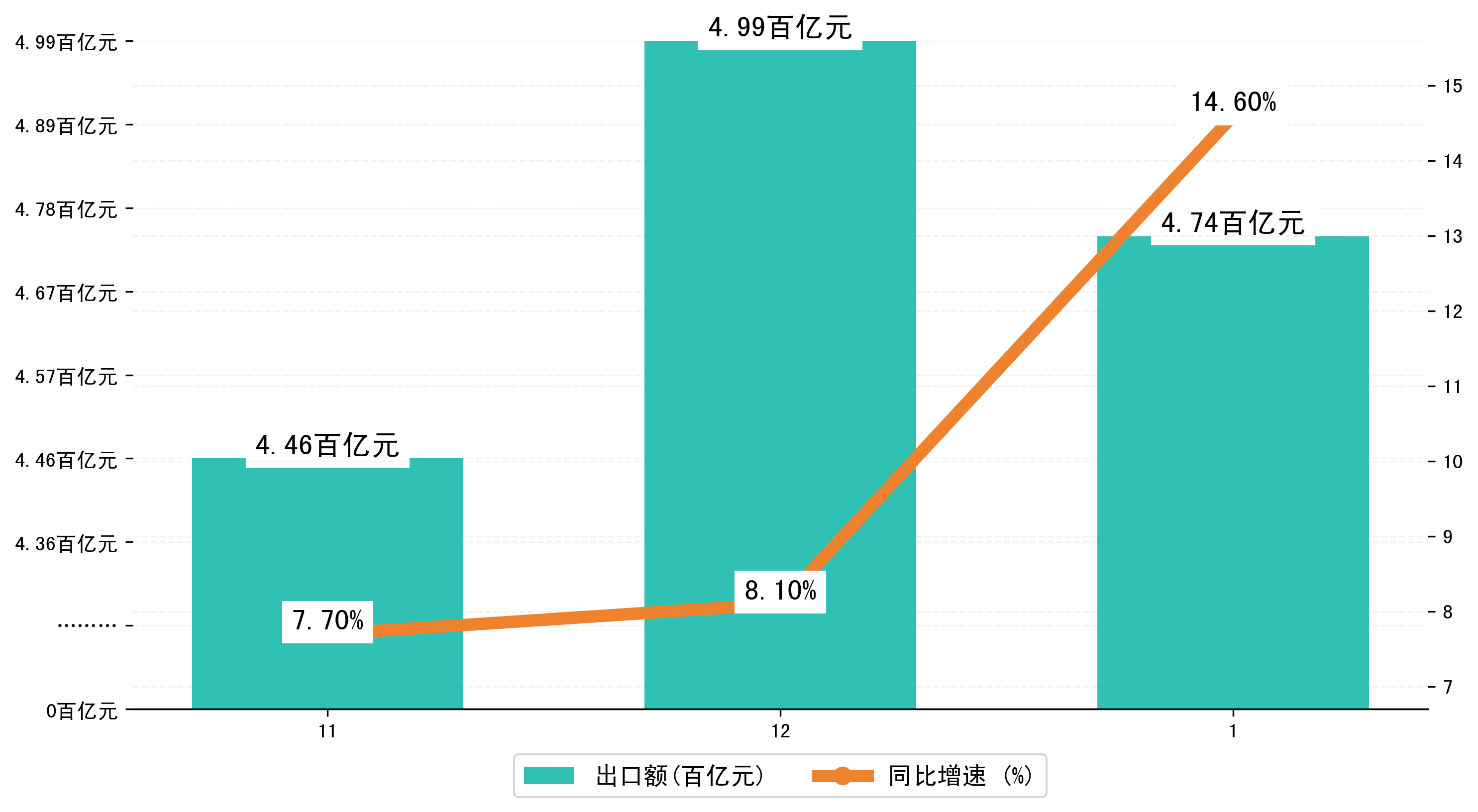 以人民币计,2025年1-1月无锡市出口额为474,3982.8796万元,相比上年同期增加了60,2979.1949万元,同比增加了14.60%。