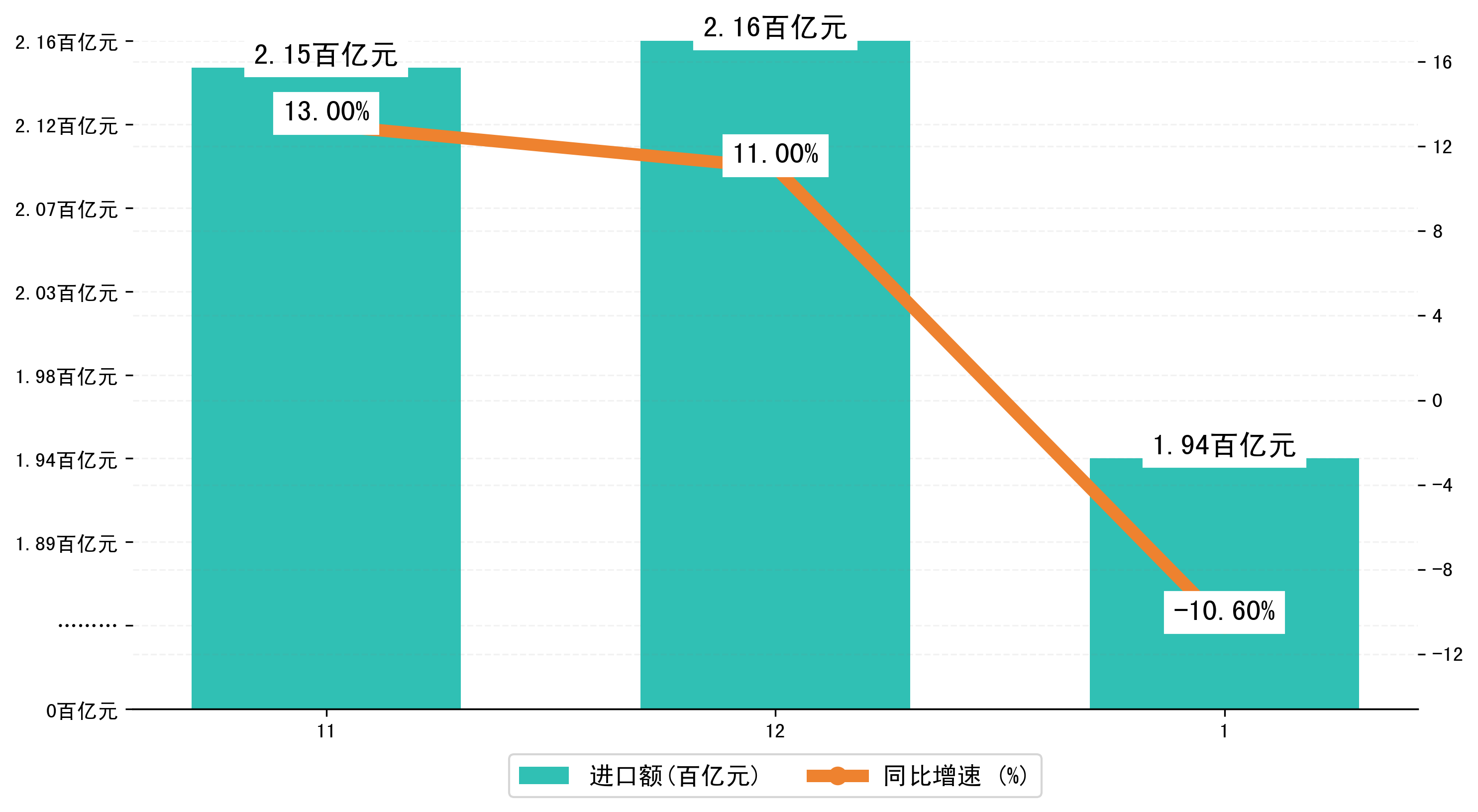 以人民币计,2025年1-1月无锡市进口额为193,9034.2764万元,相比上年同期减少了22,8805.4443万元,同比减少了-10.60%。