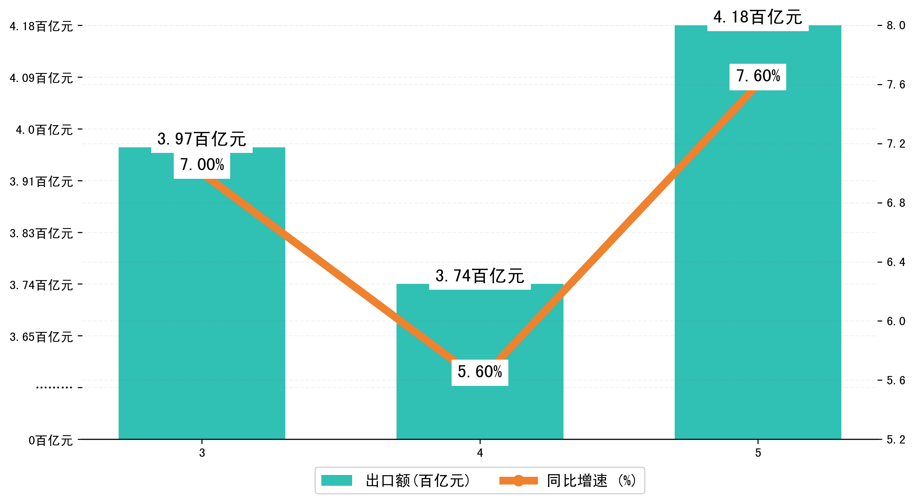 以人民币计,2024年5月无锡市出口额为417,7563.9398万元,相比上月增加了44,0642.6957万元;相比上年同期增加了57,8588.823万元,同比增加了7.60%。