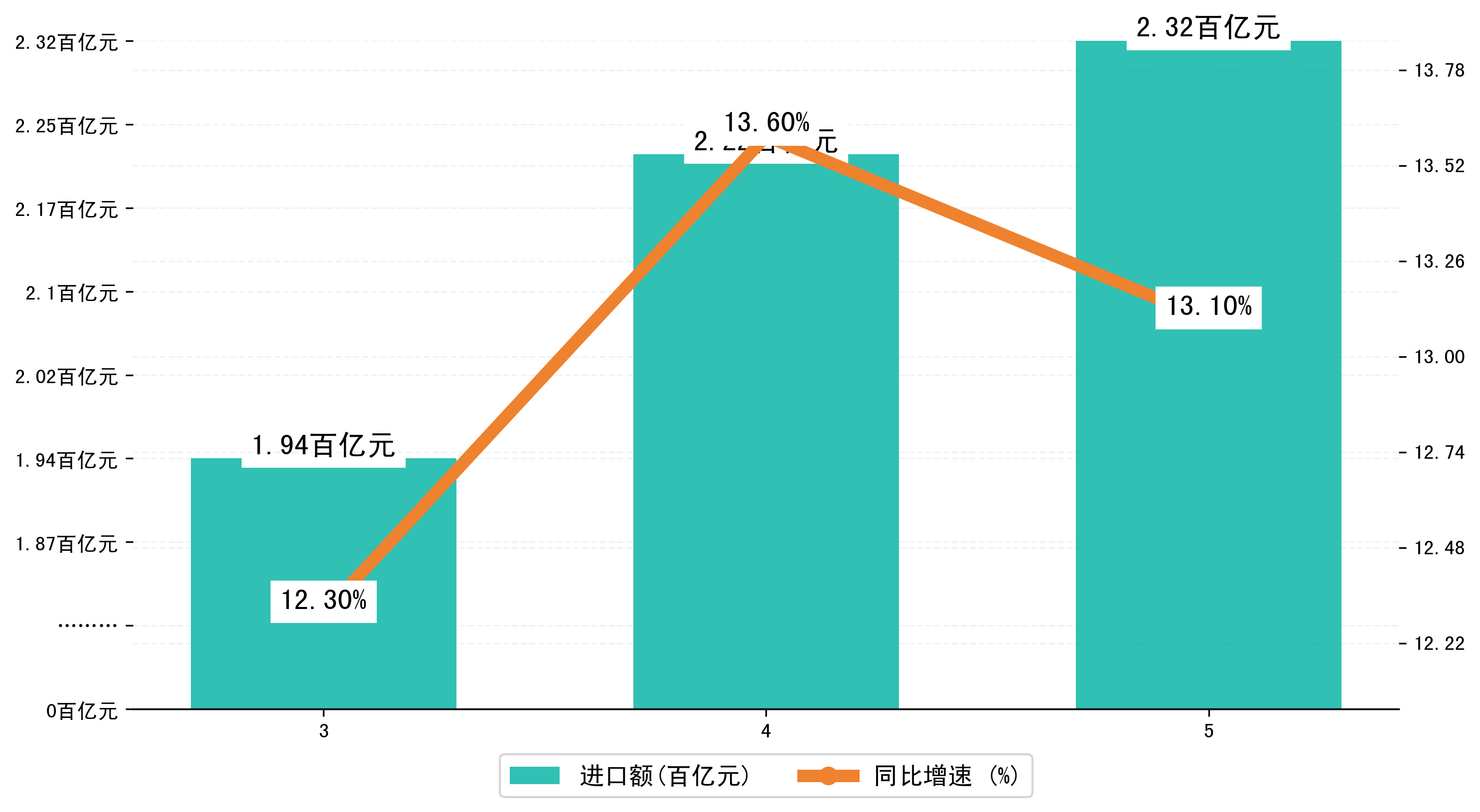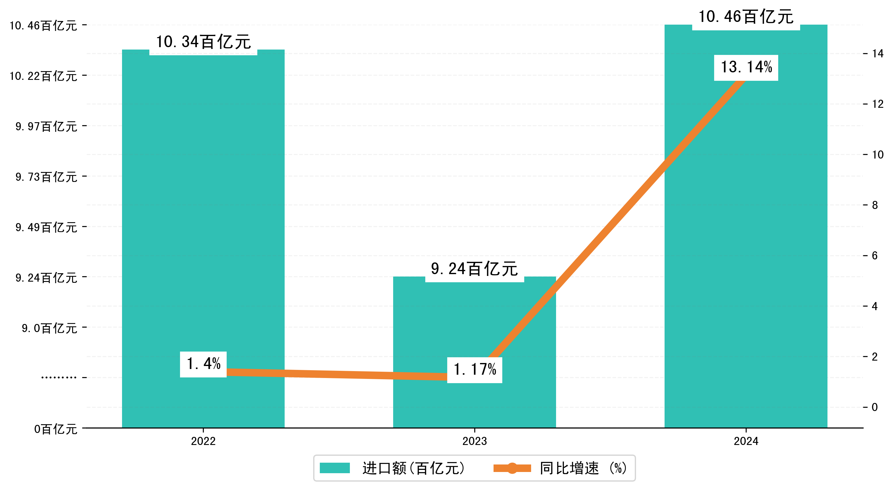 以人民币计,2024年1-5月无锡市进口额为1045,8339.7661万元,相比上年同期增加了121,4432.805万元,同比增加了13.10%。