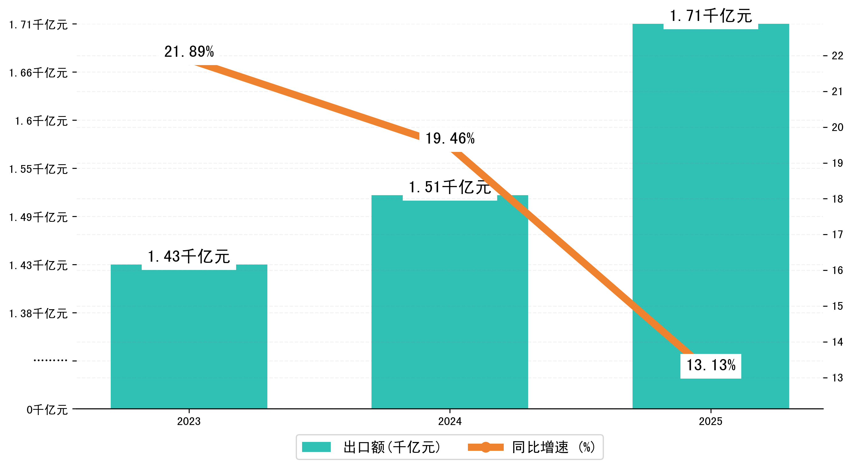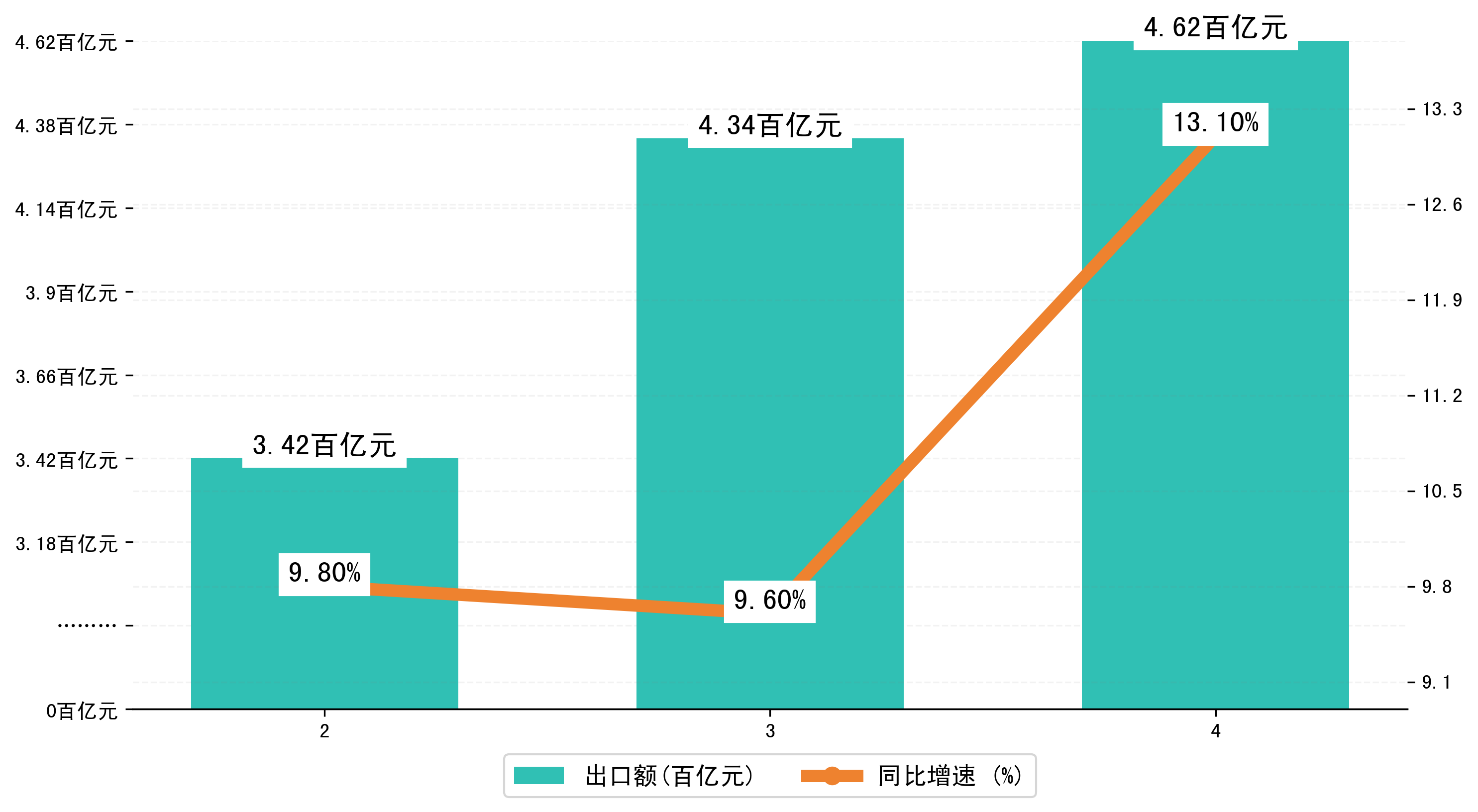 以人民币计,2025年1-4月无锡市出口额为1713,4309.6129万元,相比上年同期增加了198,8550.6417万元,同比增加了13.10%。