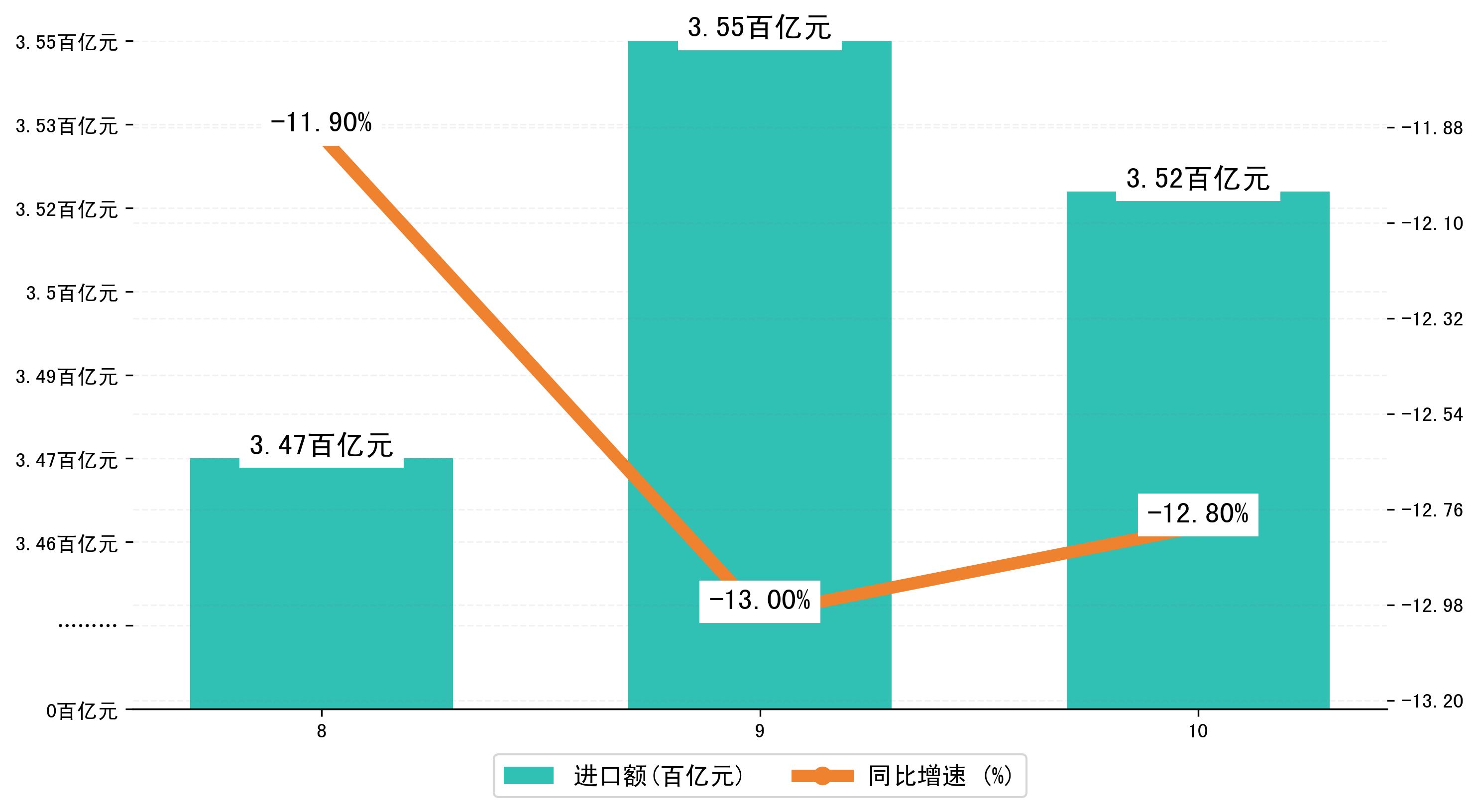 以人民币计,2024年10月厦门市进口额为351,9678.8446万元,相比上月减少了2,6573.2281万元;相比上年同期减少了39,7036.5981万元,同比减少了-12.80%。